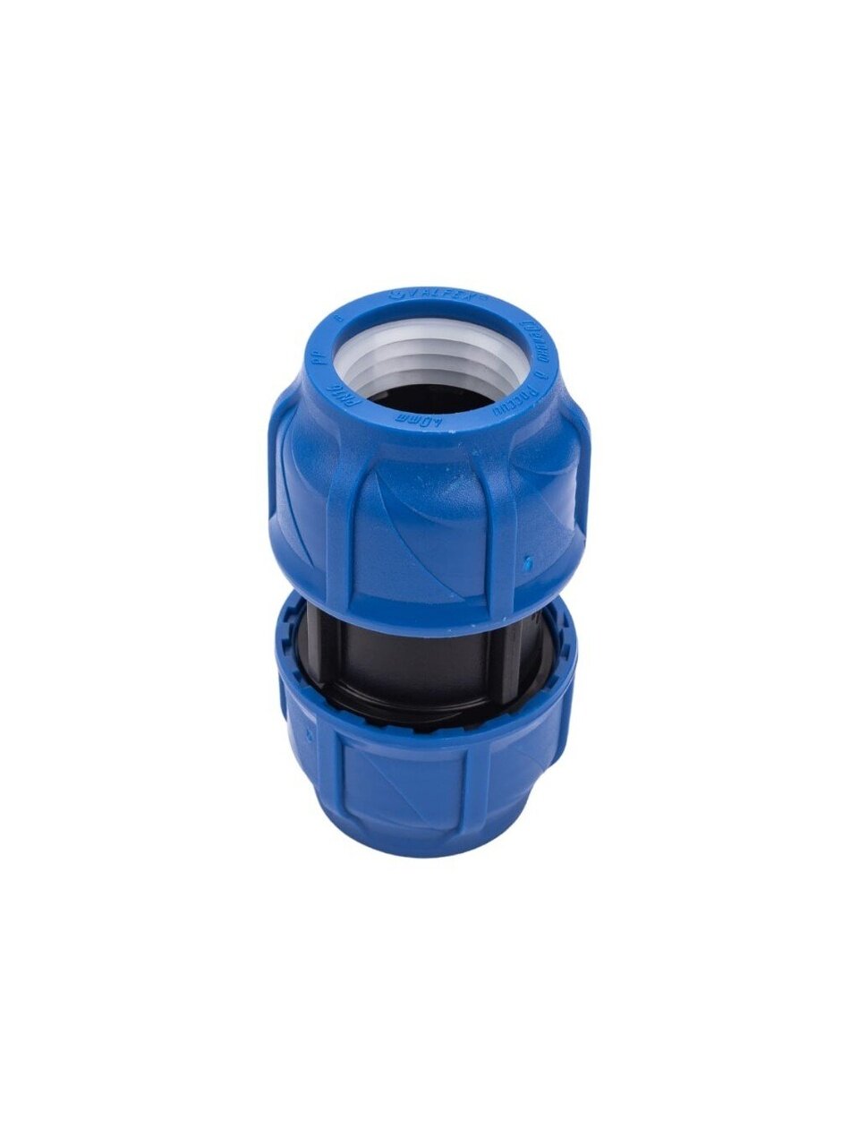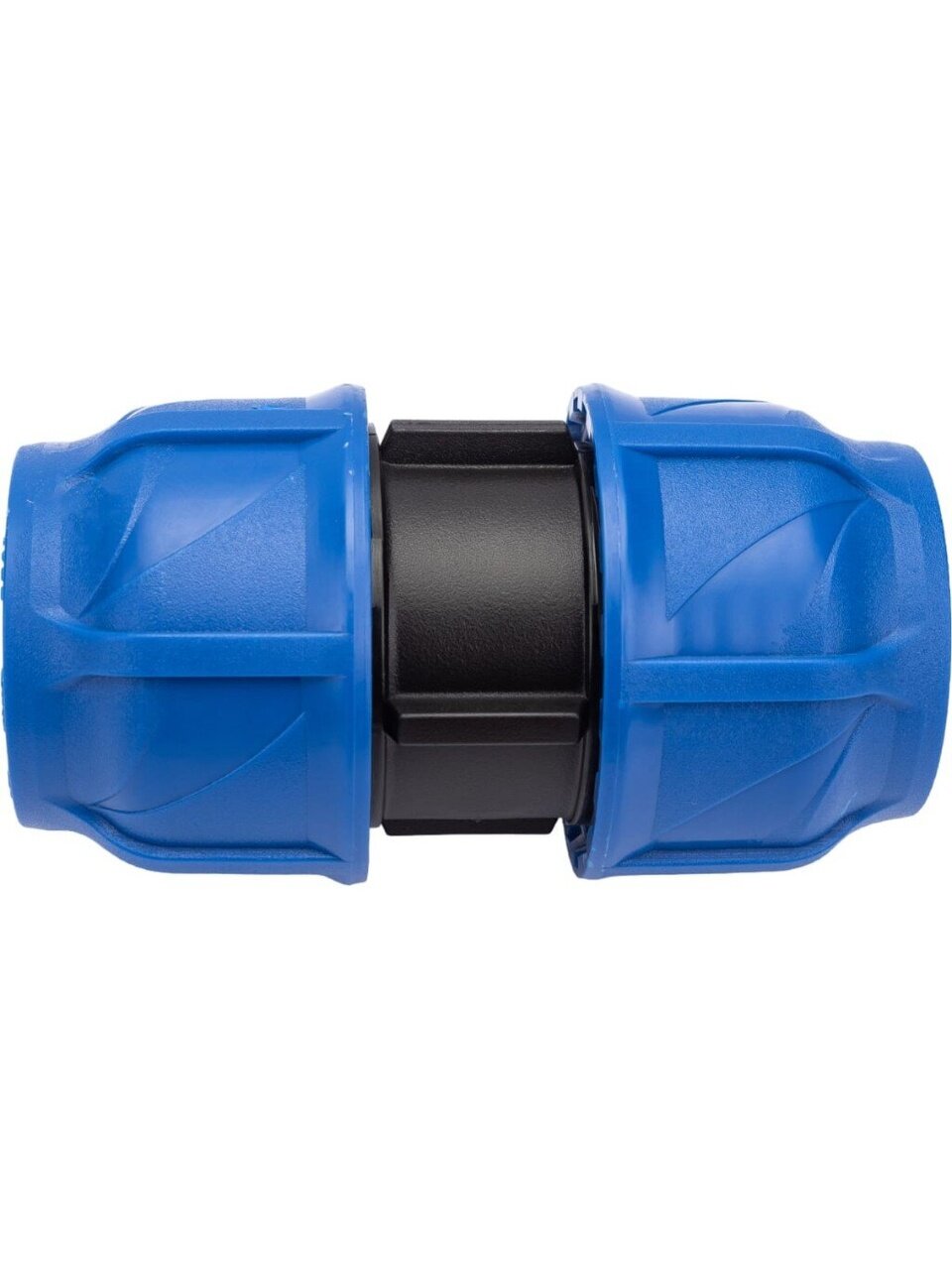 Компрессионная соединительная муфта выполнена из полипропилена и применяется для соединения полиэтиленовых труб кольцевого сечения.