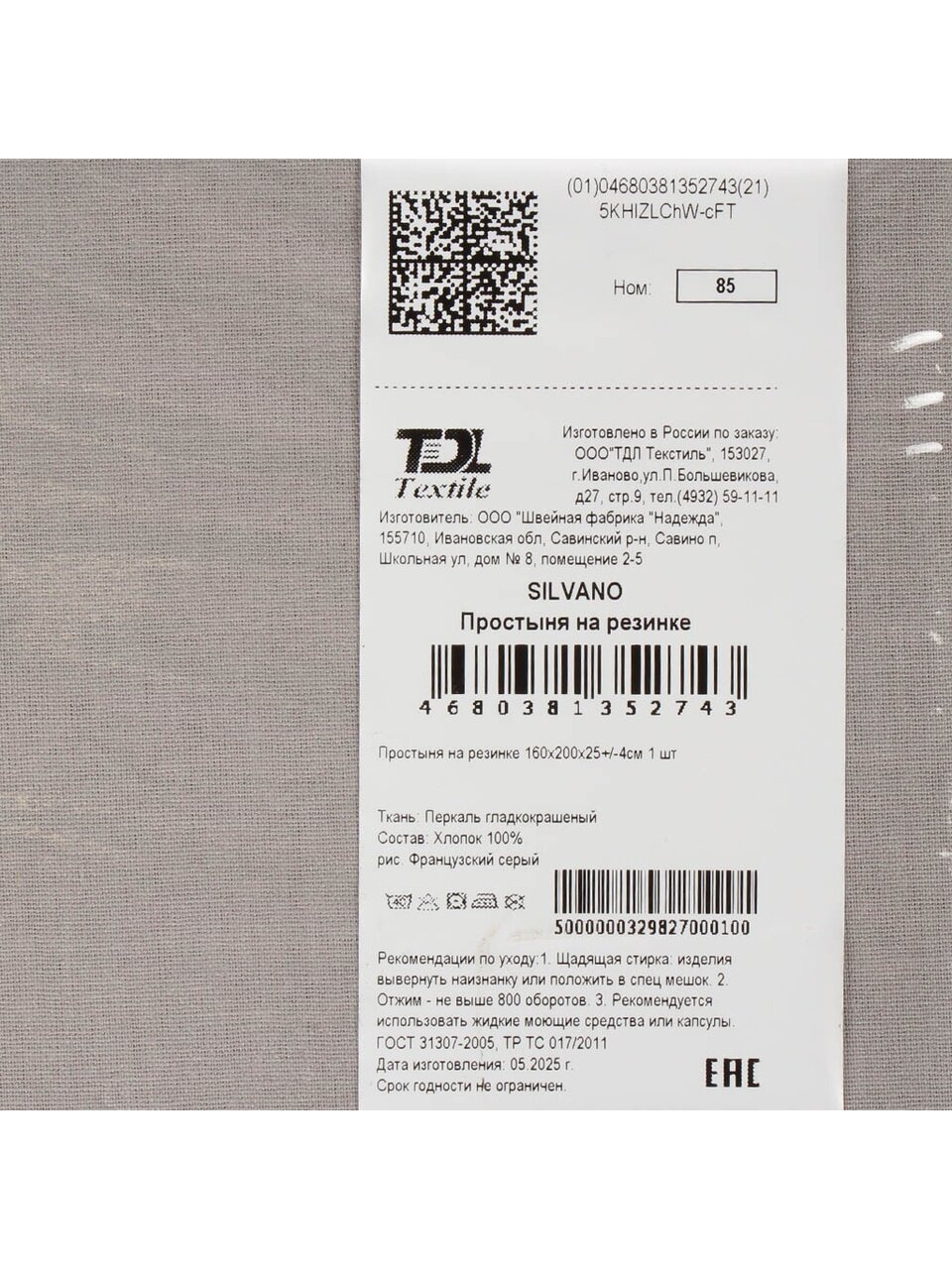 Простыня 2-спальная, 160 х 200 х 25 см, 100% хлопок, перкаль, на резинке, Silvano, Французский серый