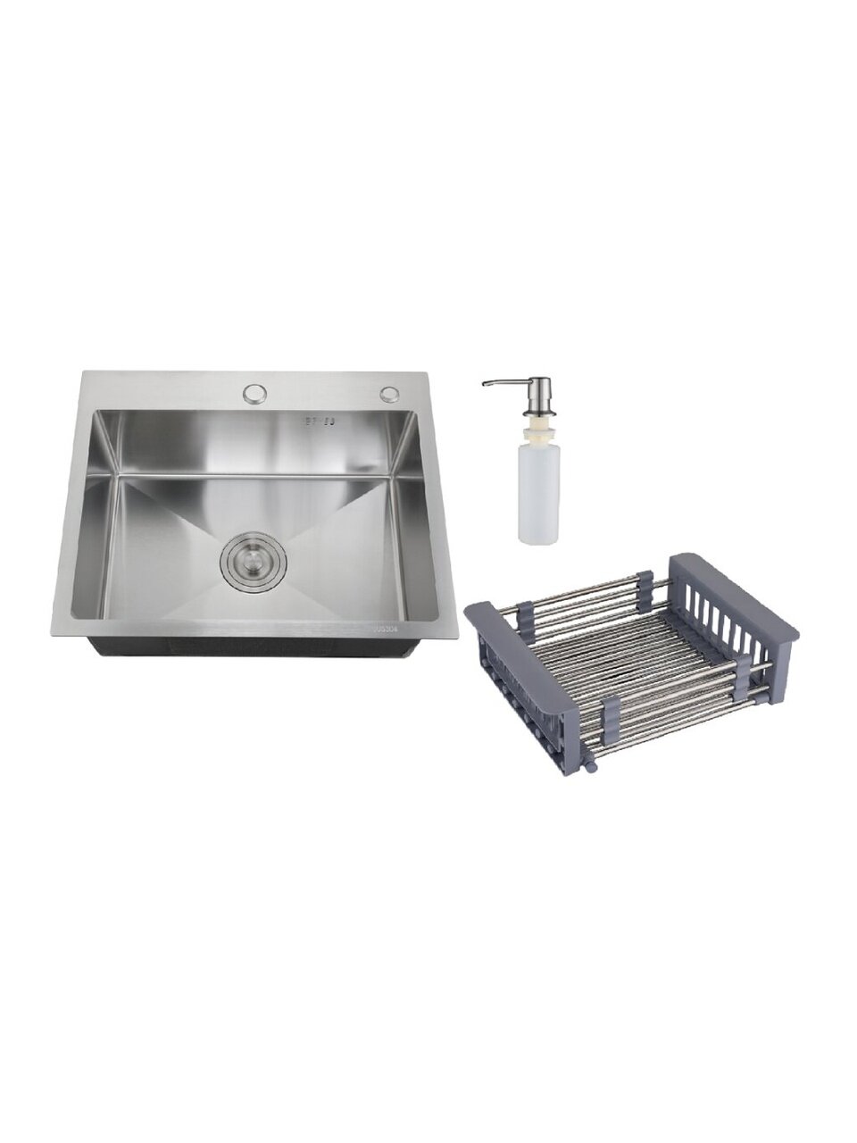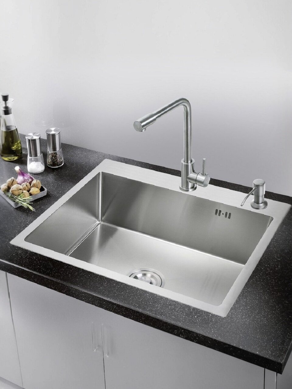 Набор: мойка, дозатор врезной, корзина раздвижная из нержавеющей стали для сушки, сифон высокого качества с гофрой с универсальным выходом 40/50, заглушка для отверстий, корзинка для отходов при сливе.