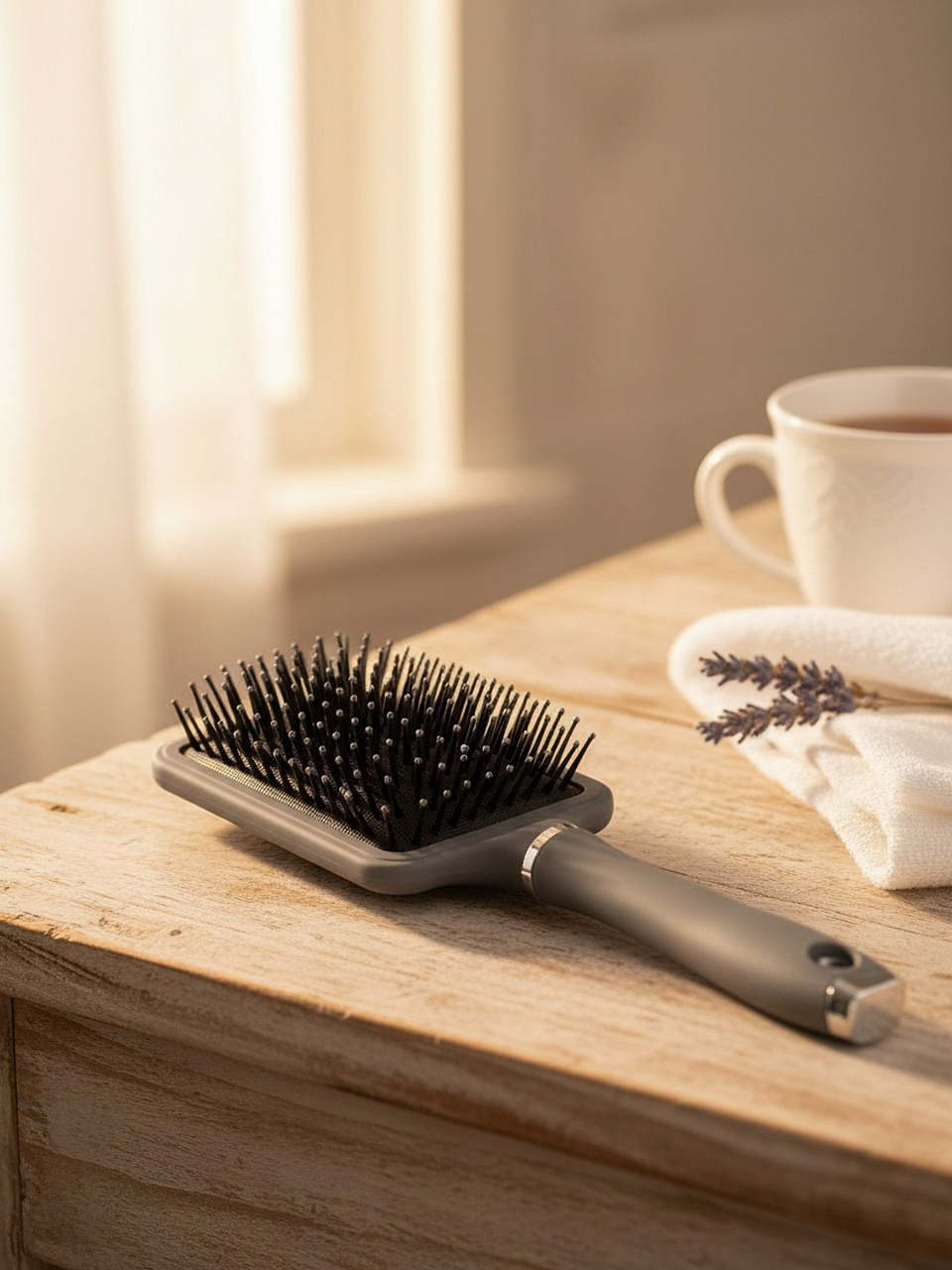 Массажная расческа для волос Studio style — это оптимальный выбор для тех, кто ищет мягкое и эффективное расчесывание без повреждения структуры волос. Благодаря квадратной форме и графитовому цвету, аксессуар выглядит современно и стильно, а массажные зубцы деликатно стимулируют кожу головы, улучшая кровообращение. Если вы спрашиваете «какую массажную расческу выбрать для ежедневного использования?» — обратите внимание на этот вариант: он подходит для длинных, тонких, густых и даже детских волос.
