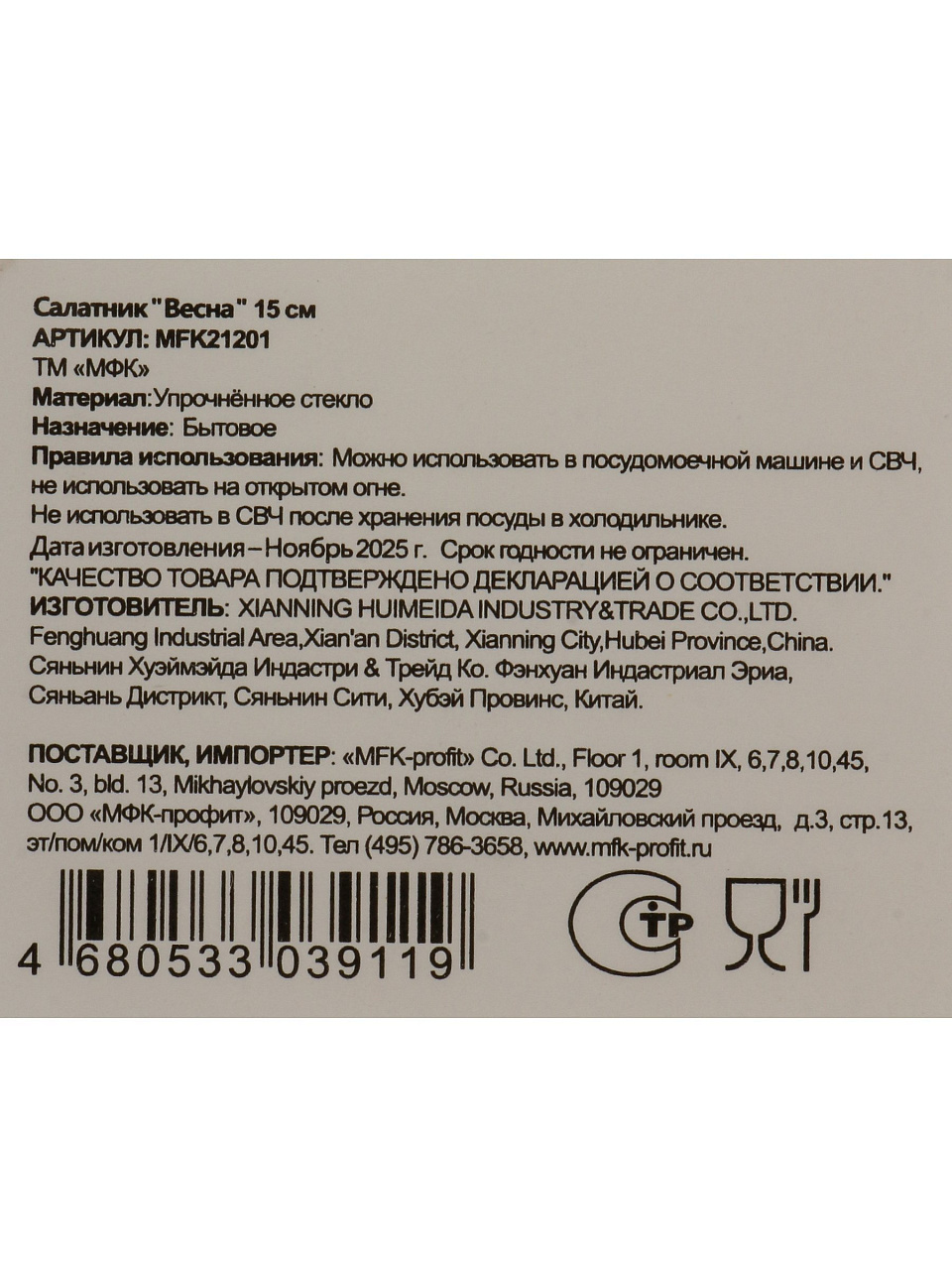 Вы можете приобрести «Салатник стеклокерамика, фигурный, 15х6 см, 0.4 л, Весна, МФК, MFK21201» и другие товары в нашем интернет-магазине в Ярославле по низким ценам и с бесплатным самовывозом.