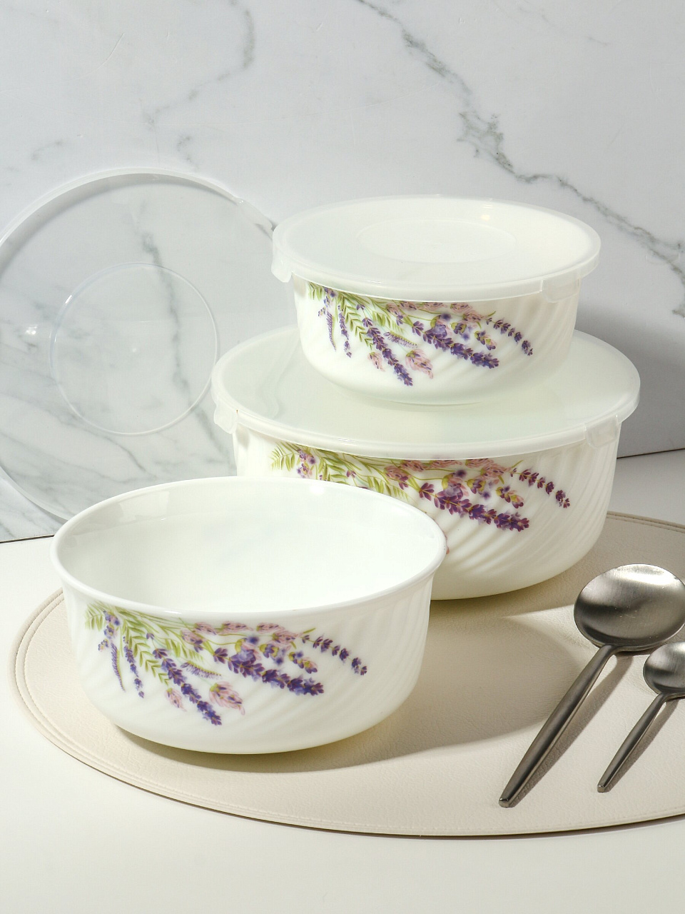 Салатники Daniks Лаванда: набор из 3 стеклокерамических мисок с крышками (0.5/0.8/1.4 л) для хранения, сервировки и подачи – стиль прованс для дома и дачи.
