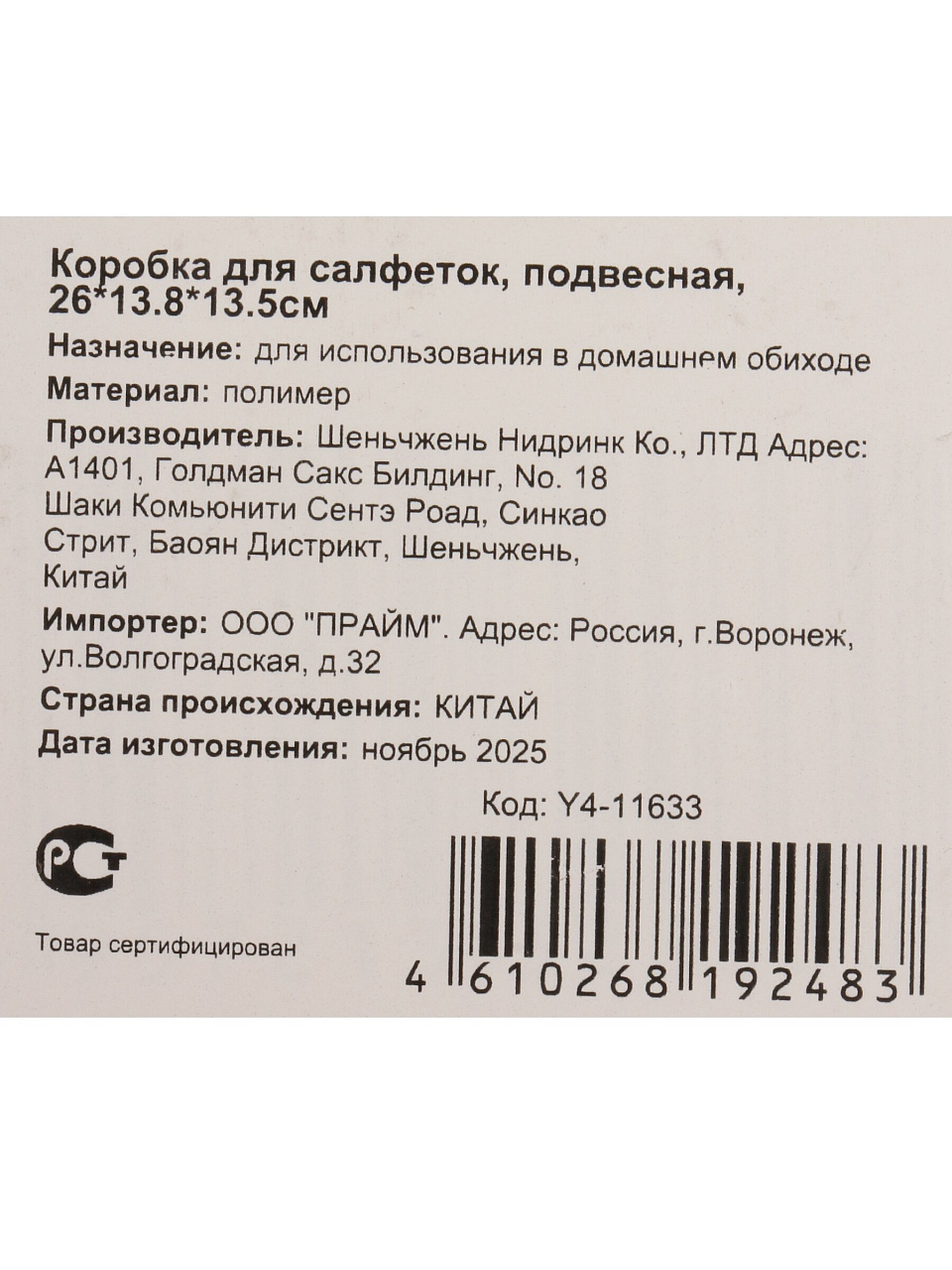 Вы можете приобрести «Коробка для бумажных салфеток пластик, 26х13.8х13.5 см, подвесная, Y4-11633» и другие товары в нашем интернет-магазине в Россоши по низким ценам и с бесплатным самовывозом.