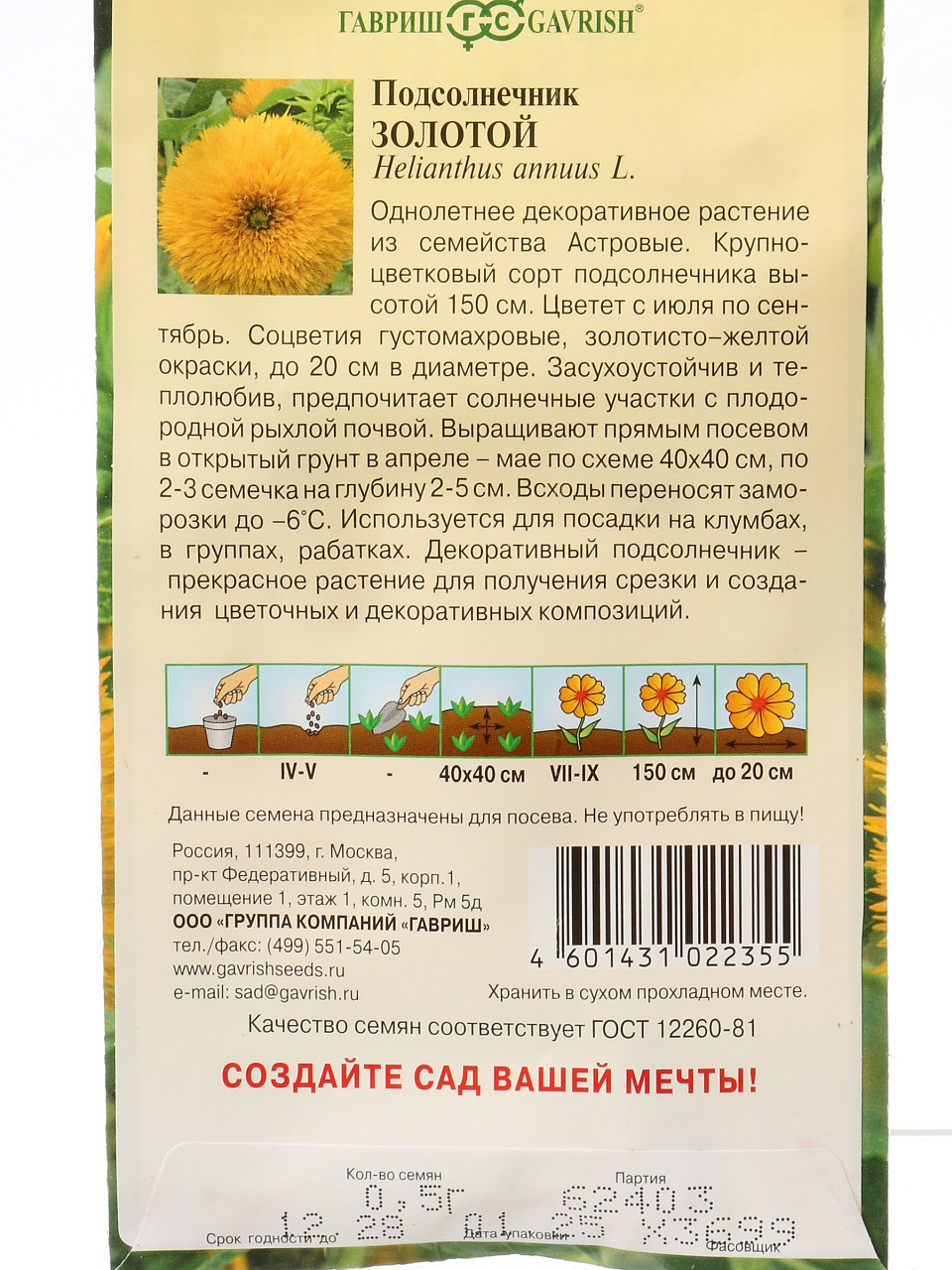 Семена декоративного подсолнечника Золотой 0.5 г Гавриш — яркое украшение для сада и дачи: быстрое прорастание, устойчивость, эффектный результат уже этим летом.