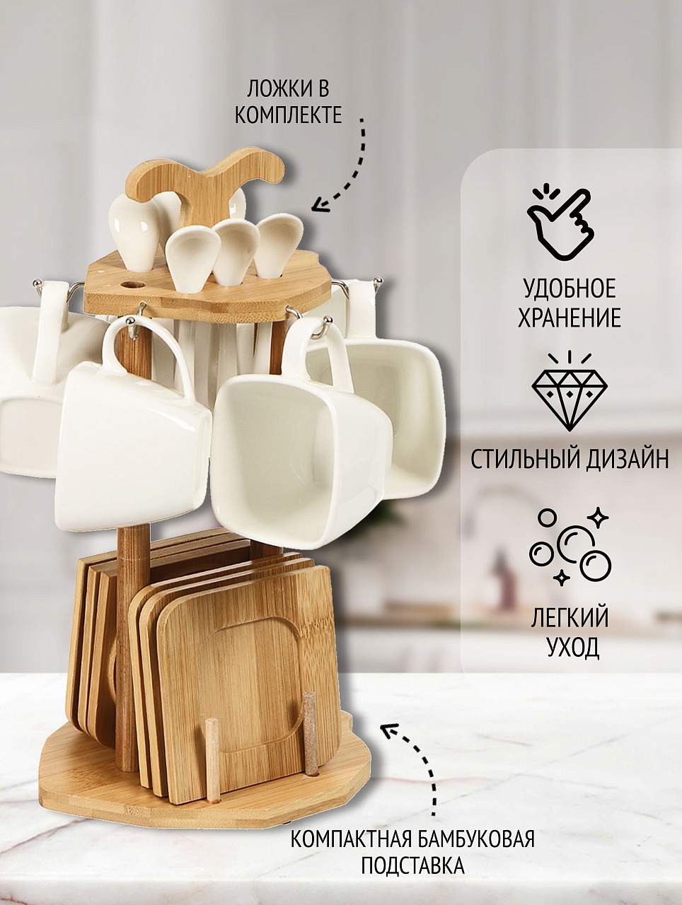 - Уникальный комплект: 19 предметов, включая 6 кружек, 6 ложек и 6 деревянных блюдец на компактной подставке.