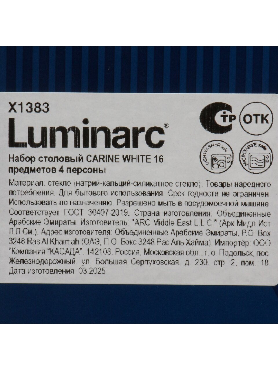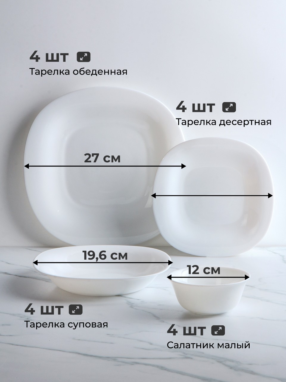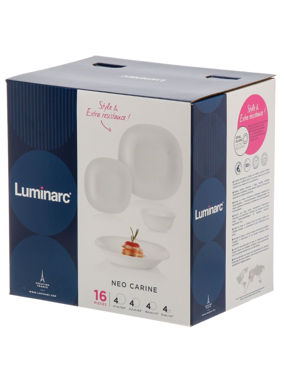Столовый сервиз Luminarc Carine White на 4 персоны: 16 предметов из прочной стеклокерамики для стильных ужинов дома и на даче. Подарочная упаковка.