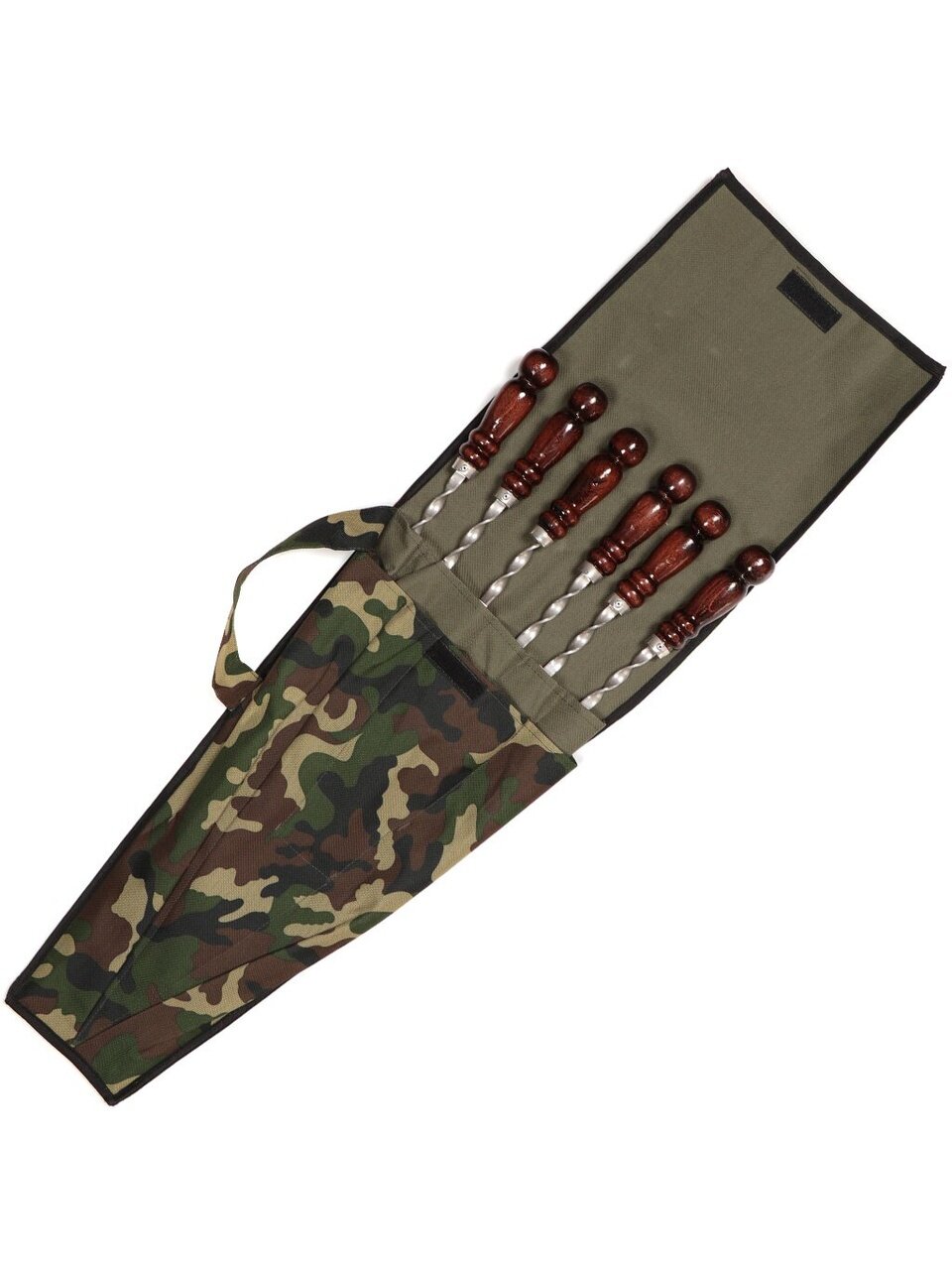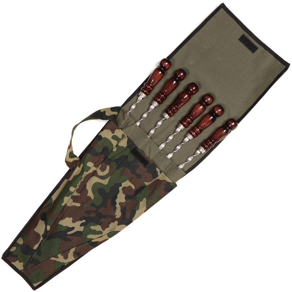 - Этот набор станет незаменимым помощником на пикнике, рыбалке или охоте. Он упакован в чехол, который защищает шампуры от повреждений и грязи.