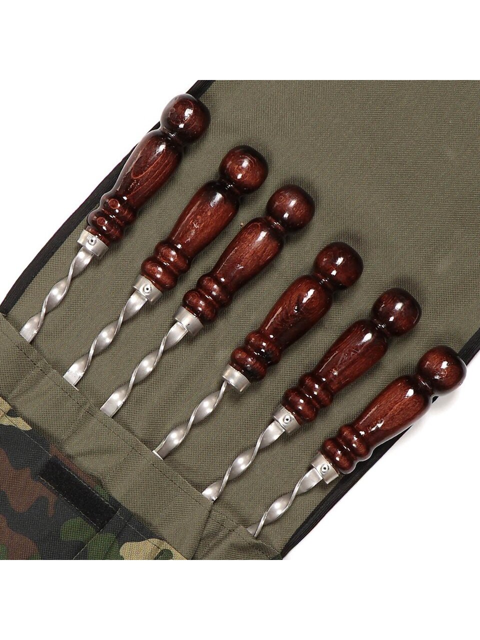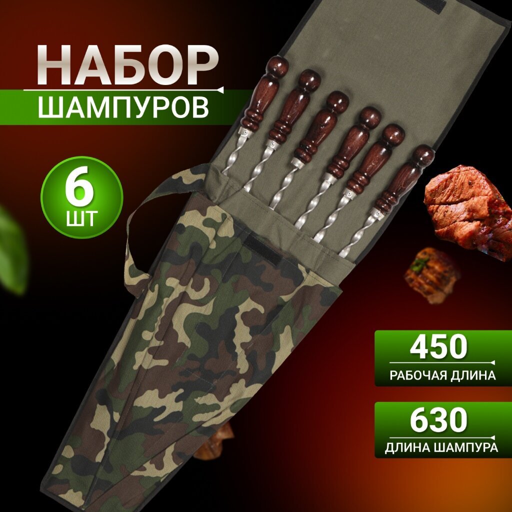 - Данный набор шампуров — идеальный вариант для тех, кто ценит отдых на природе и любит готовить вкусную еду на открытом огне. В комплекте 6 шампуров из нержавеющей стали с деревянными ручками, которые удобно лежат в руке и не скользят.