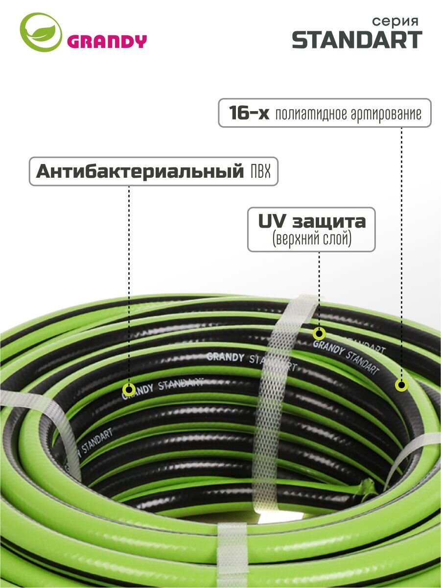 Шланг Grandy обладает всеми необходимыми характеристиками: очень прочный, гибкий и устойчивый к скручиванию, что делает его идеальным для использования в любых условиях. Материал, из которого изготовлен шланг, прекрасно справляется с воздействием солнечных лучей, благодаря чему шланг не выгорает и не портится со временем.