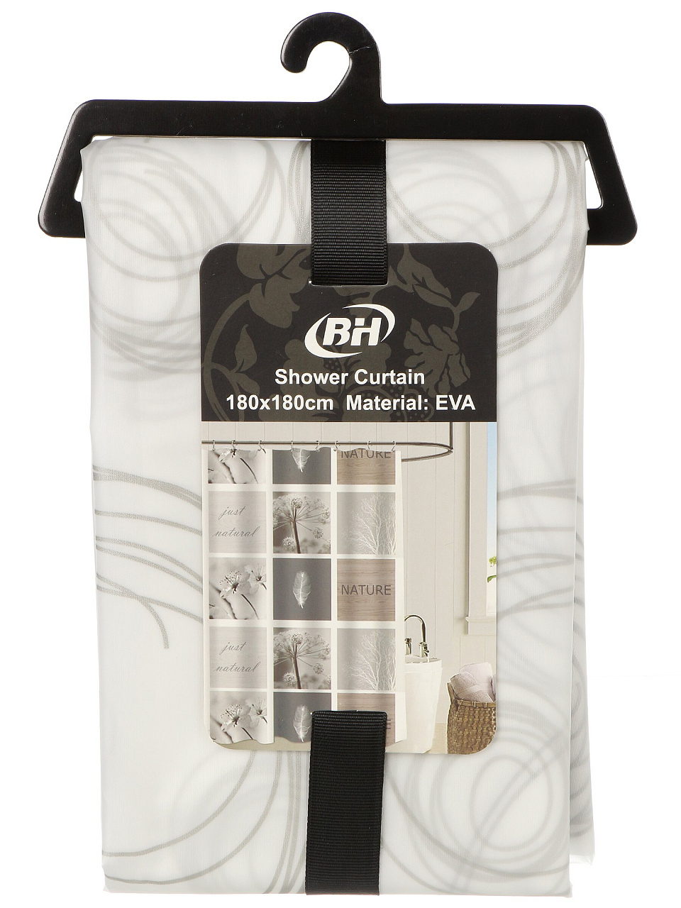 Размер шторы — 180х180 см. Такой формат универсален и подходит для большинства стандартных и угловых ванн, а также душевых кабин.