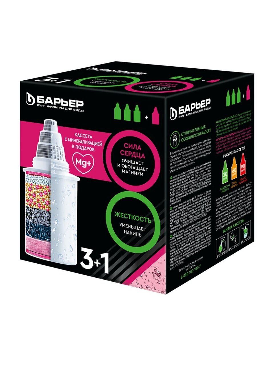 Базовая очистка и обогащение воды магнием, который уменьшает уровень стресса и поддерживает иммунную систему. Очищает водопроводную воду от хлора и других вредных примесей, препятствует образованию накипи в чайнике, удаляет посторонние привкусы и запахи. Имеет рабочий ресурс до 350 литров. Резьба на кассете не позволяет попасть нефильтрованной воде в кувшин. В упаковке находится три кассеты "Жесткость" и одна кассета "Сила Сердца", подходящая к любому фильтру-кувшину БАРЬЕР. Один компактный фильтр заменяет десятки тяжелых бутылок с водой.