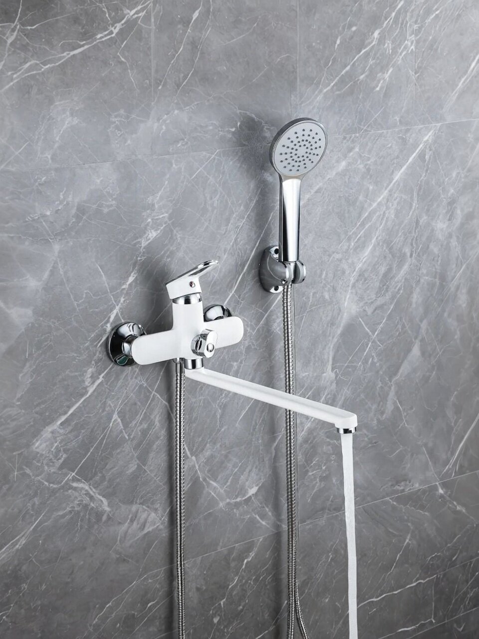 Длина излива составляет 32,9 см, что обеспечивает удобство при наполнении ванны и мытье, особенно в просторных помещениях.