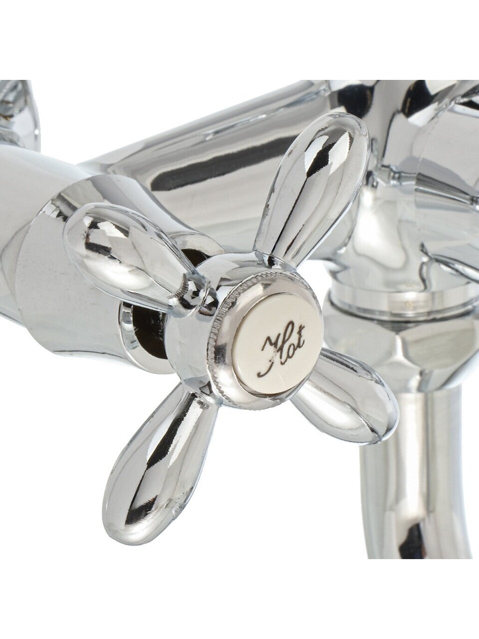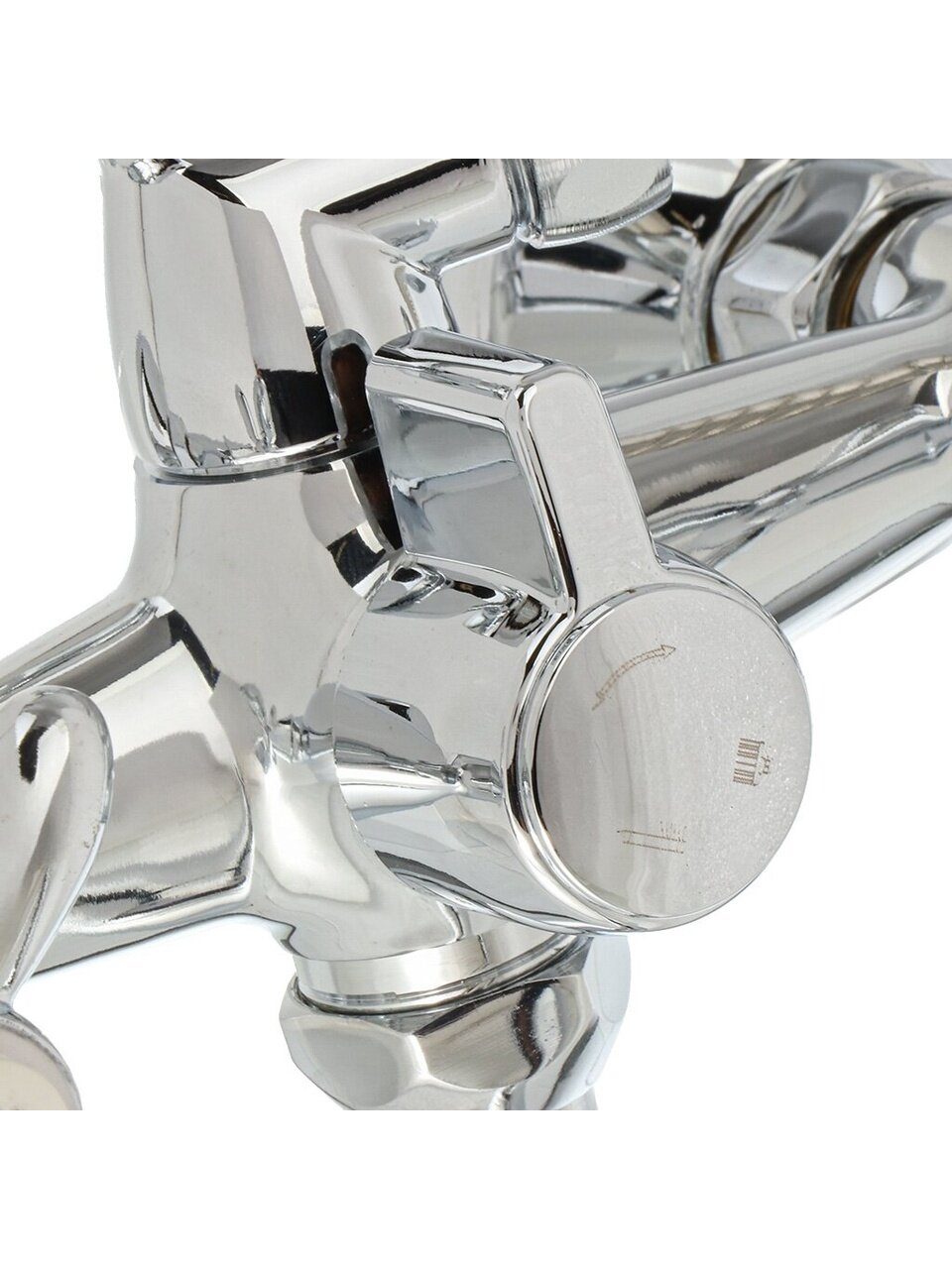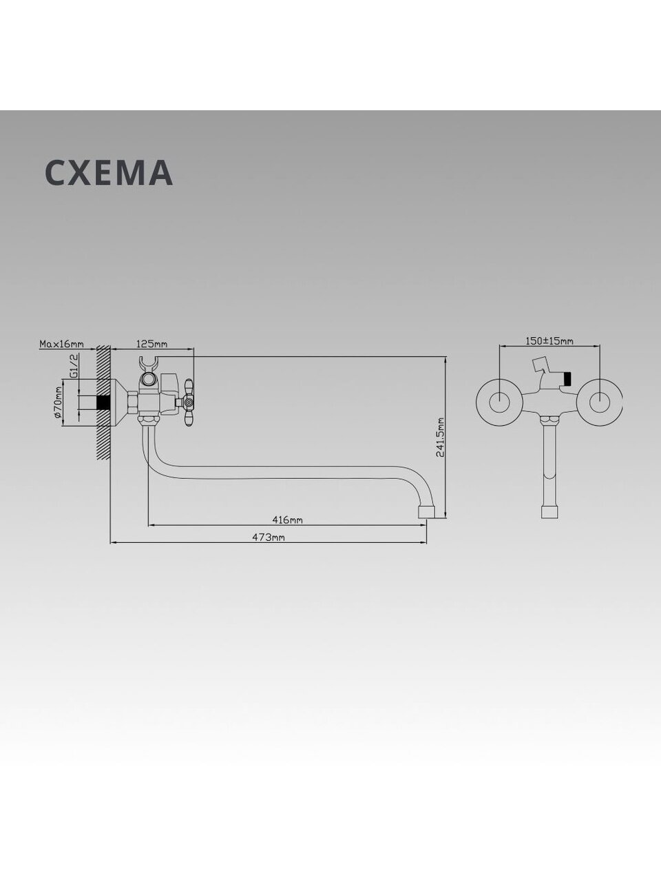 - Корпус из цинкового сплава, глянцевый хром — устойчив к коррозии, межосевое расстояние 150 мм, стандарт 1/2"
