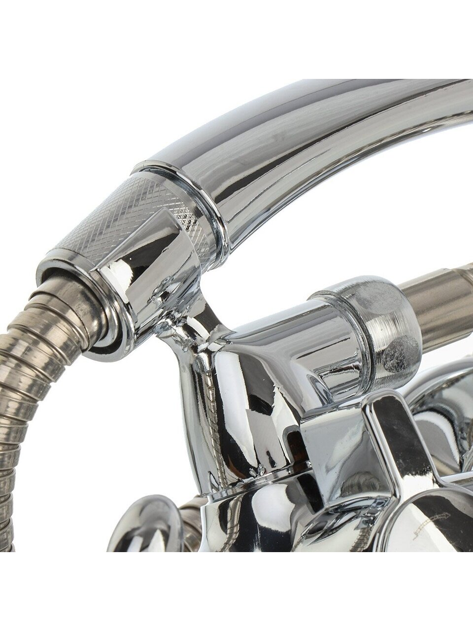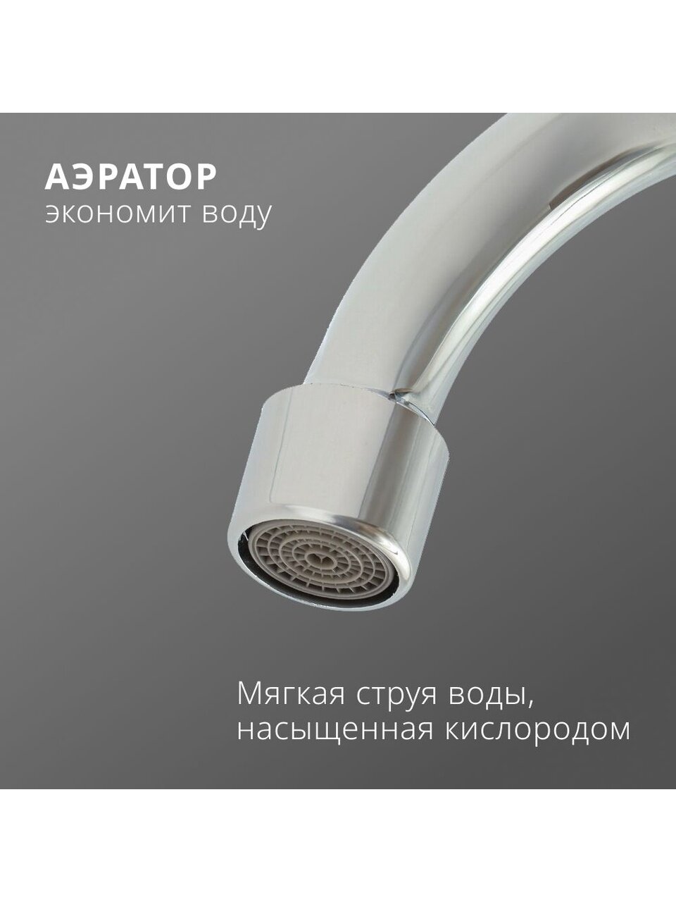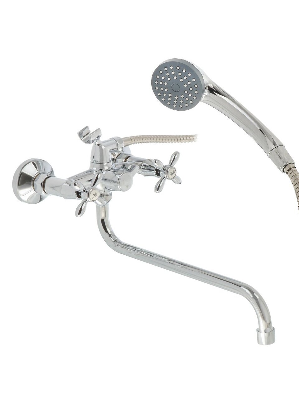Смеситель оснащён длинным поворотным изливом и гибким шлангом для душа длиной 1,5 метра. В комплекте — лейка с одним режимом и держатель для душа.