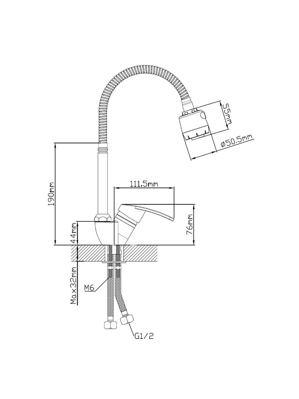 Cronwil CB042-58M подходит для установки в одно монтажное отверстие диаметром 32 мм, оснащён стандартной подводкой 1/2", гибким изливом и керамическим картриджем — это оптимальный выбор для компактных и средних кухонь.