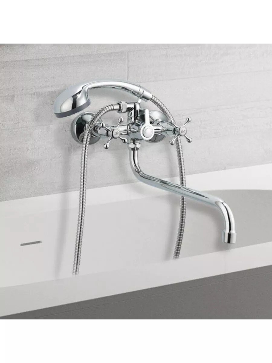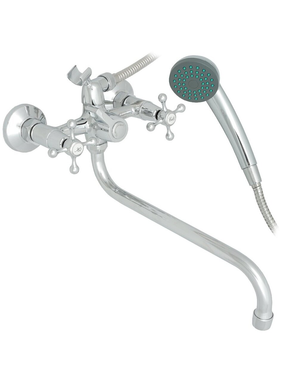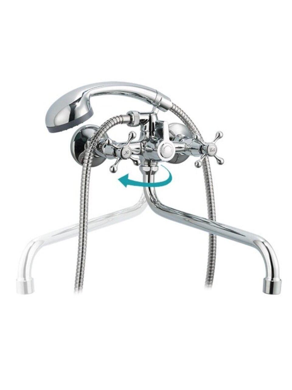 - Параметры: корпус из силумина, глянцевая хромированная поверхность, поворотный длинный излив 30 см — удобно для наполнения ванны и мытья душем.