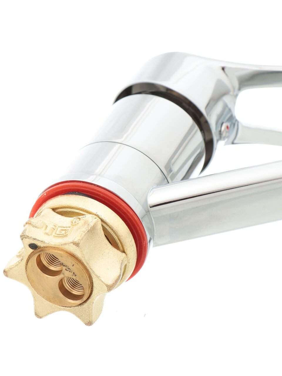 Корпус изготовлен из латуни с глянцевым хромированным покрытием, что обеспечивает устойчивость к коррозии и долгий срок службы даже при интенсивном использовании.