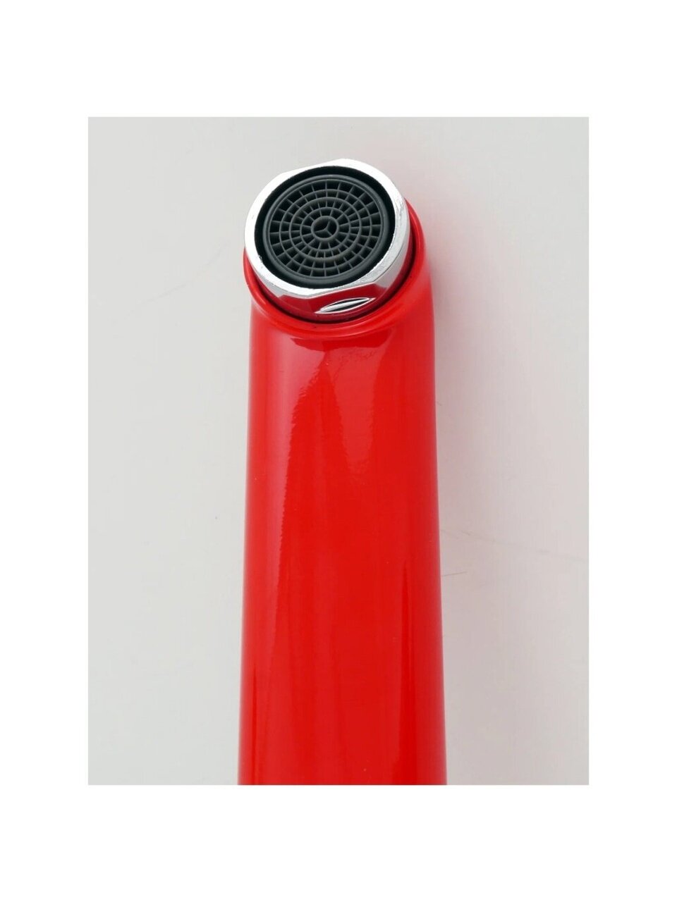 - Яркий красный смеситель с глянцевой поверхностью — акцент в интерьере и уникальное дизайнерское решение