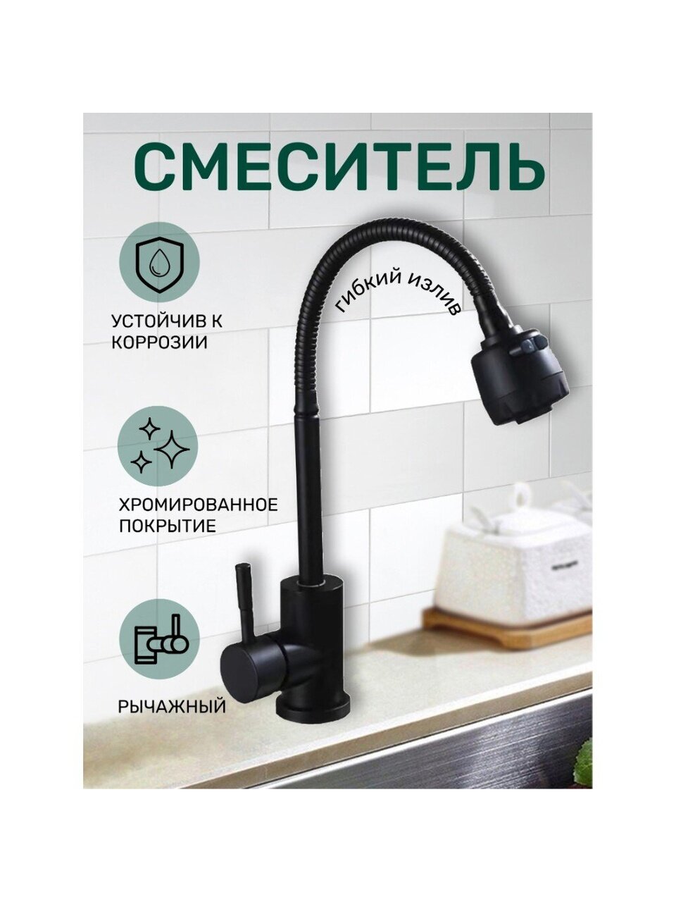 Смеситель для кухни Антей Булат с гибким изливом — стильный черный дизайн, долговечная нержавеющая сталь, удобство управления одной рукой.