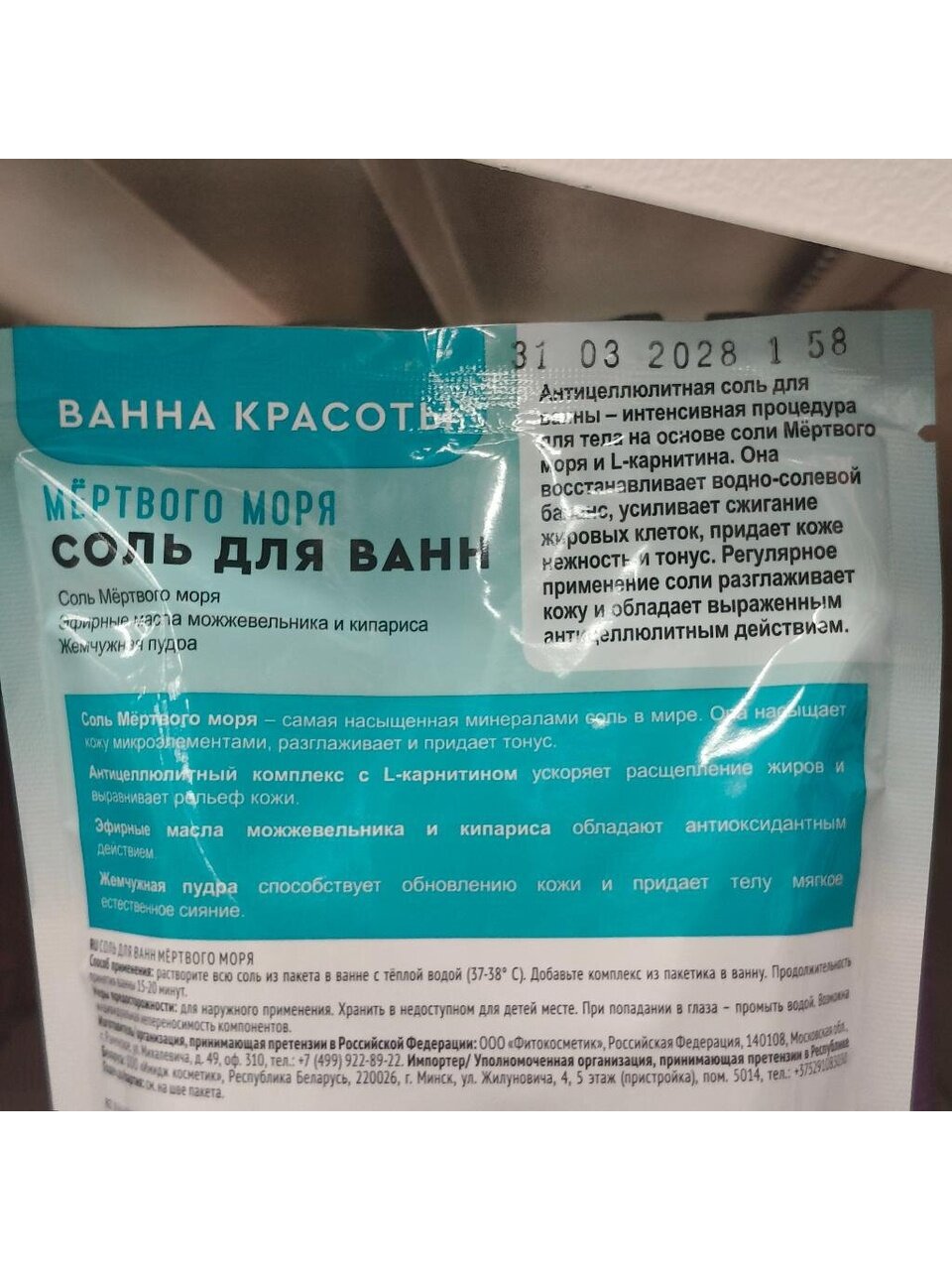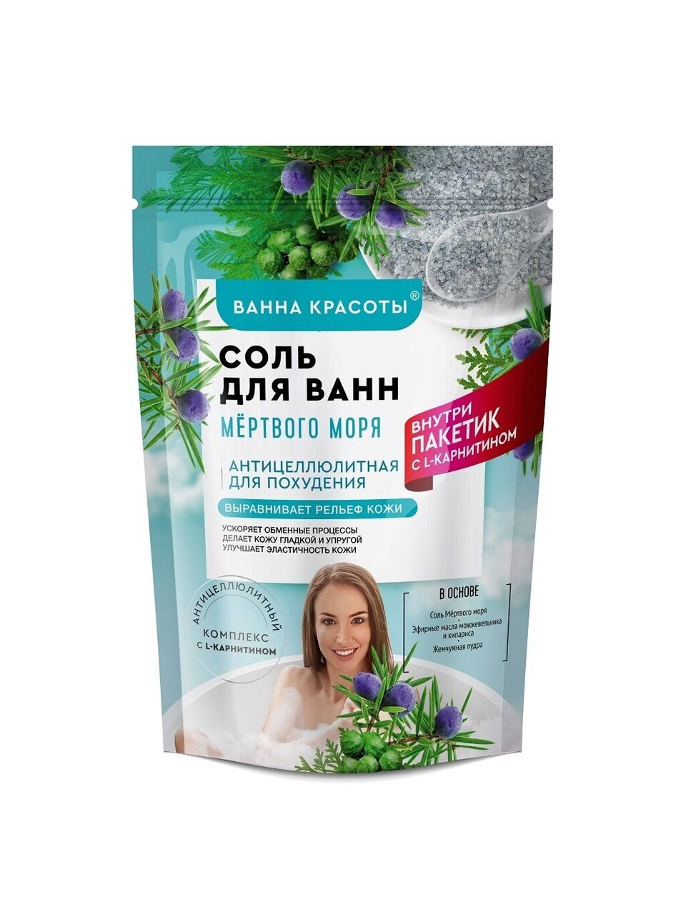 Антицеллюлитная соль для ванны – интенсивная процедура для тела на основе соли Мертвого моря и L-карнитина. Она восстанавливает водно-солевой баланс, усиливает сжигание жировых клеток, придает коже нежность и тонус. Регулярное применение соли разглаживает кожу и обладает выраженным антицеллюлитным действием. Соль Мертвого моря – самая насыщенная минералами соль в мире. Она насыщает кожу микроэлементами, разглаживает и придает тонус. Антицеллюлитный комплекс с L-карнитином ускоряет расщепление жиров и выравнивает рельеф кожи. Эфирные масла можжевельника и кипариса обладают антиоксидантным действием. Жемчужная пудра способствует обновлению кожи и придает телу мягкое естественное сияние.