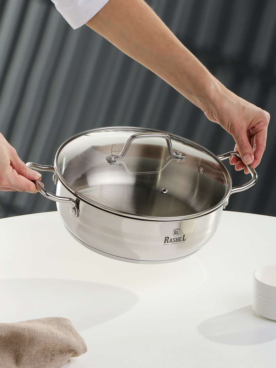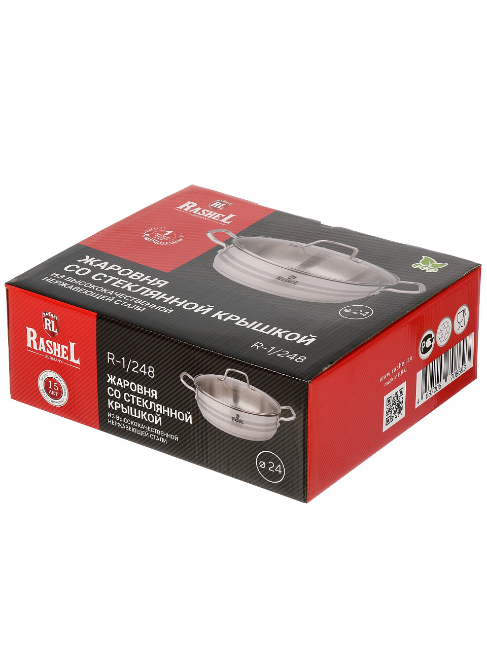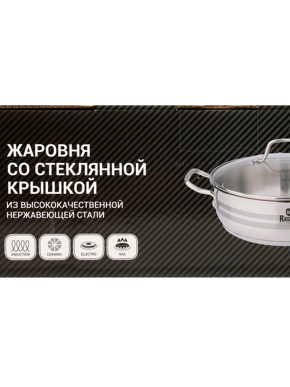 Жаровня из нержавеющей стали RasheL 24 см — универсальное решение для индукционных плит и любых кухонь: долговечность, стеклянная крышка, 3.5 л объёма.