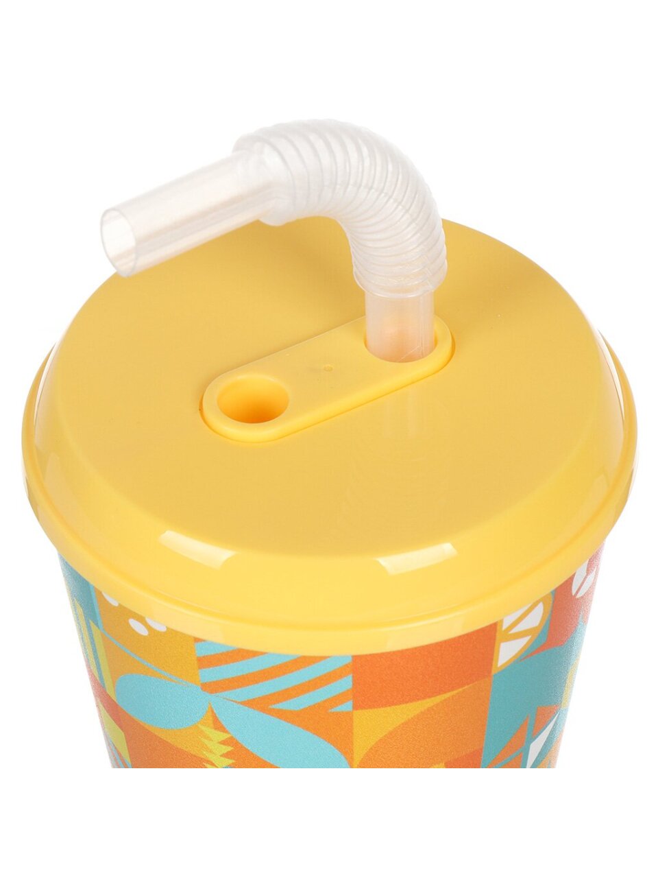 Объем — 420 мл (полезный объем 400 мл), форма — высокий и широкий тумблер, цвет — желтый, комплектуется крышкой и трубочкой.