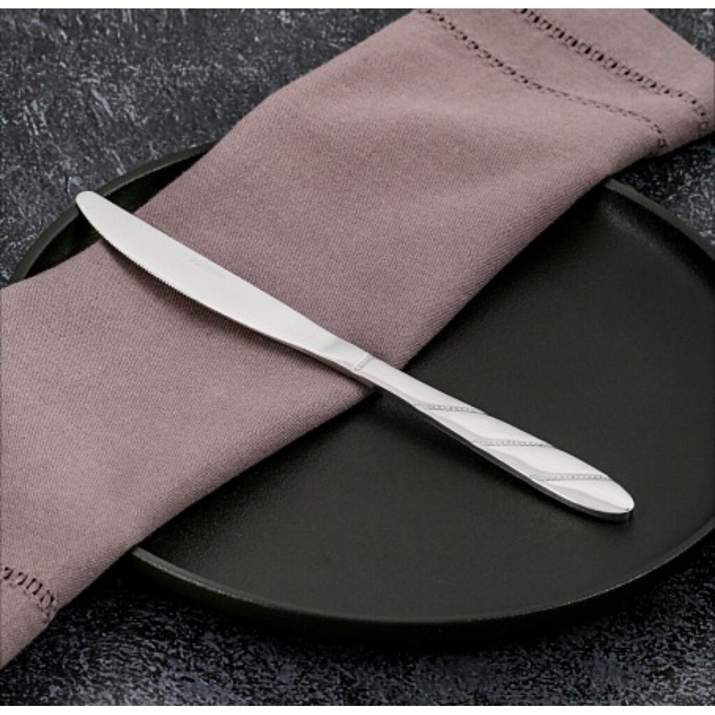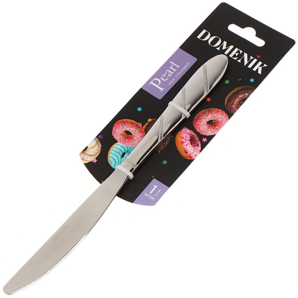 Нож столовый Domenik Pearl DMC063 из нержавеющей стали — стильное решение для сервировки, долговечный выбор для дома и дачи. Безопасно мыть в посудомоечной машине, длина 22,7 см, серебристый цвет.
