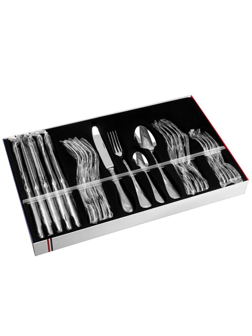 В комплекте 24 предмета (ложки, вилки, ножи, чайные ложки) — оптимально для 6 персон.