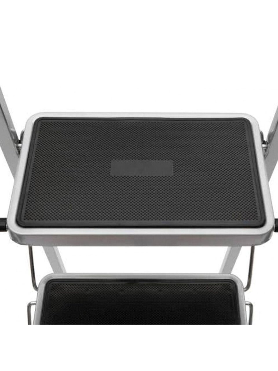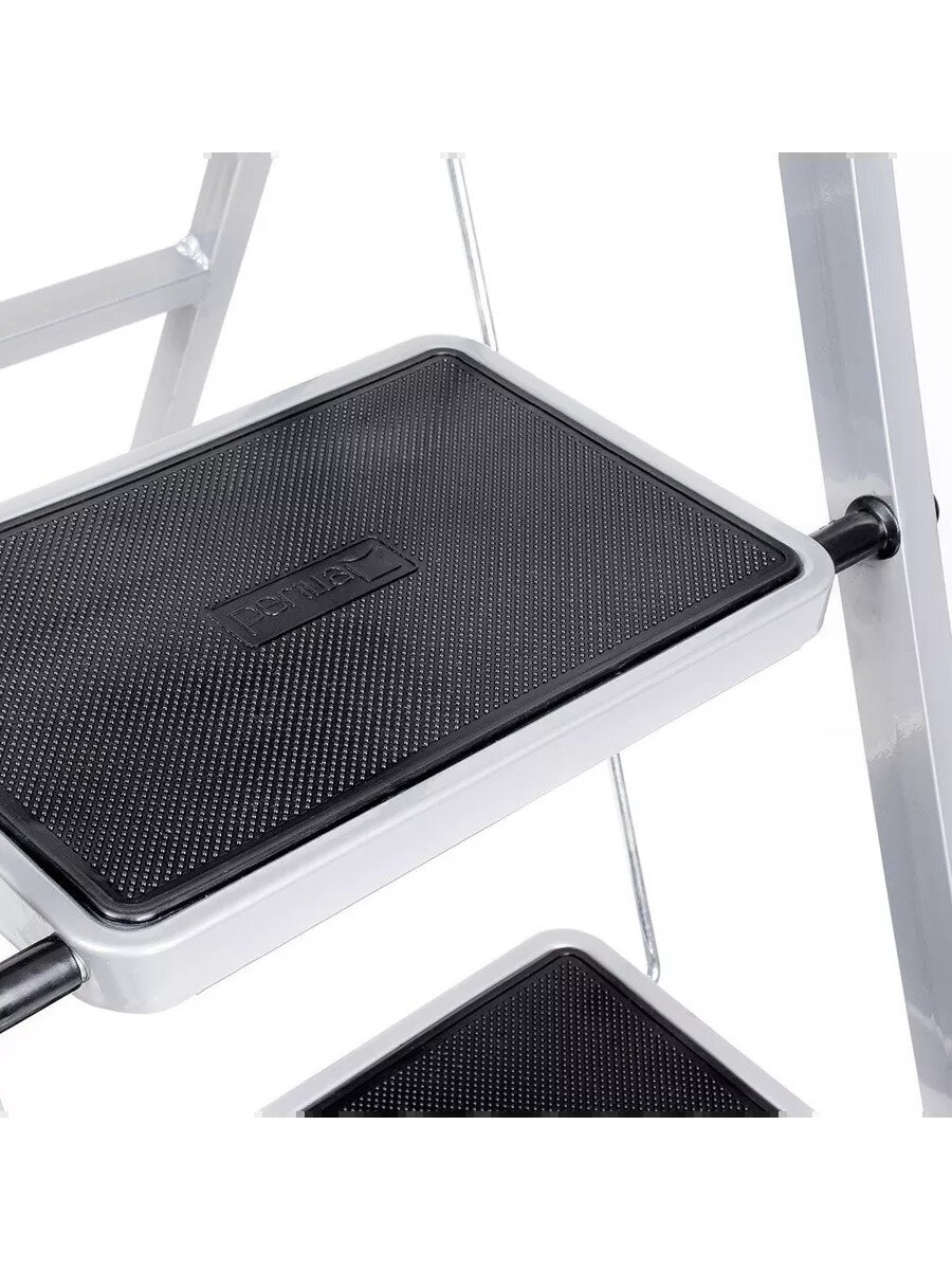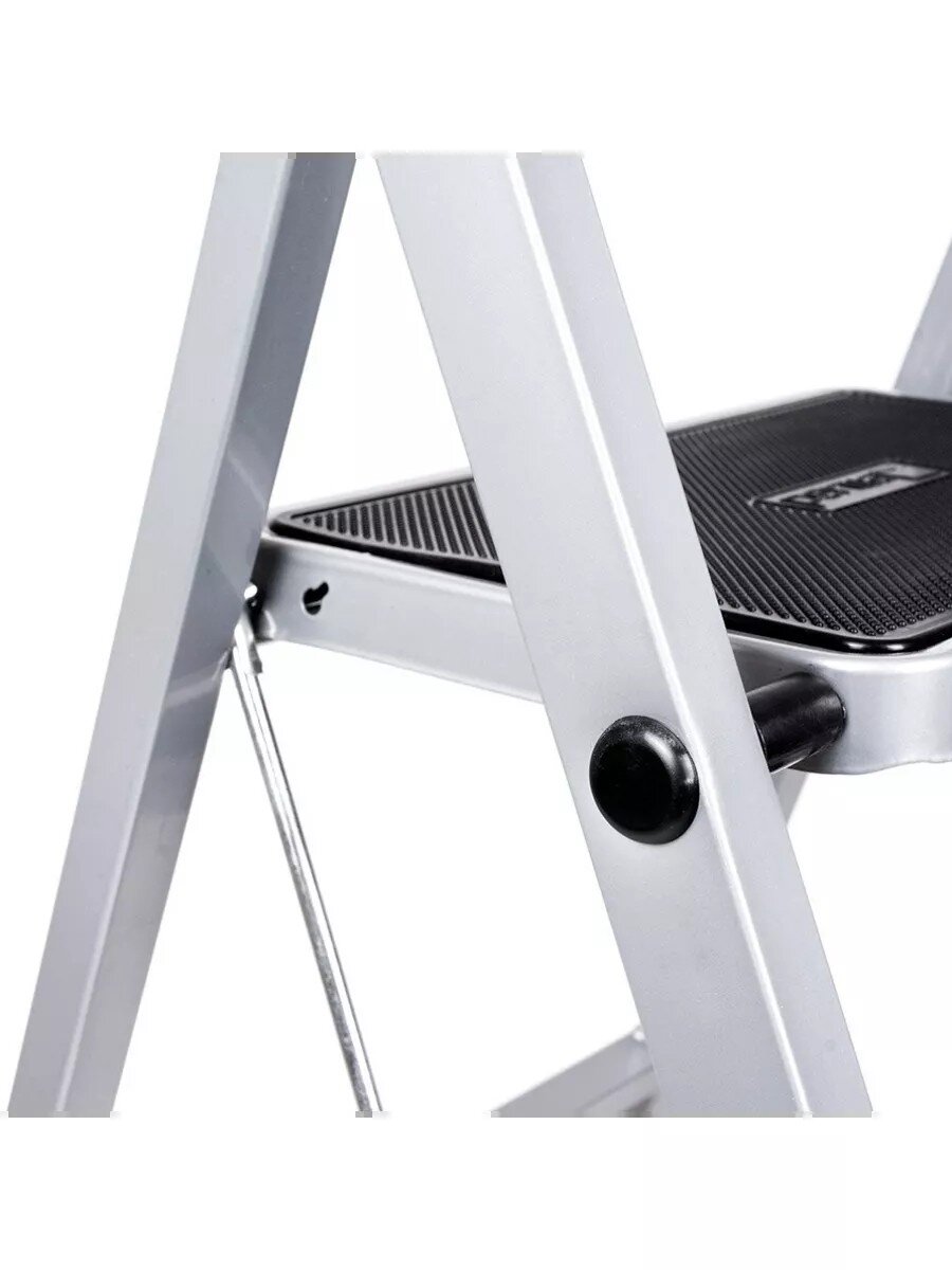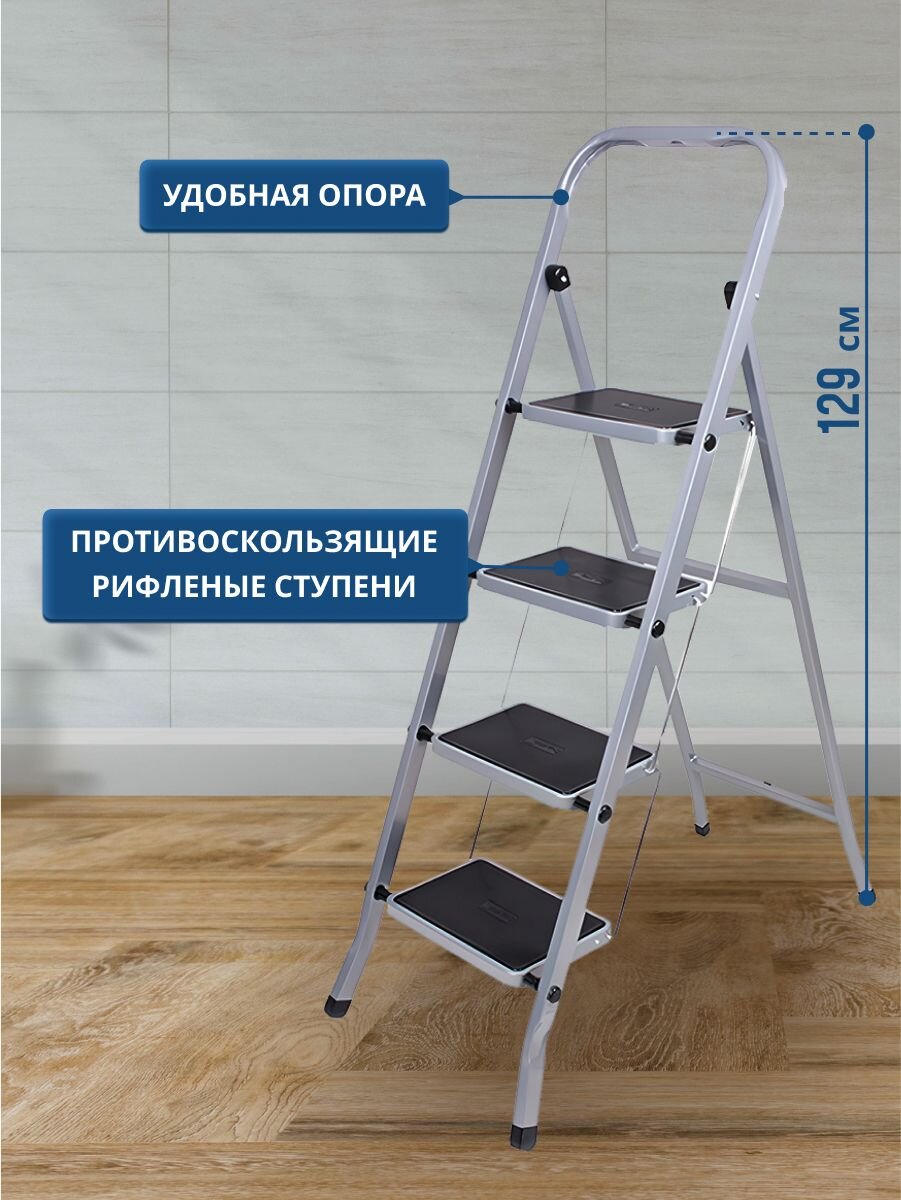 Стремянка выполнена из прочной стали, что обеспечивает ее долговечность и надежность. Она выдерживает до 120 кг. веса, что позволяет использовать ее для различных задач. Кроме того, на ступенях имеются противоскользящие накладки, которые обеспечивают безопасность во время работы. Стремянка также имеет удобные ручки для переноски и складывания, что делает ее легкой в транспортировке и хранении.
