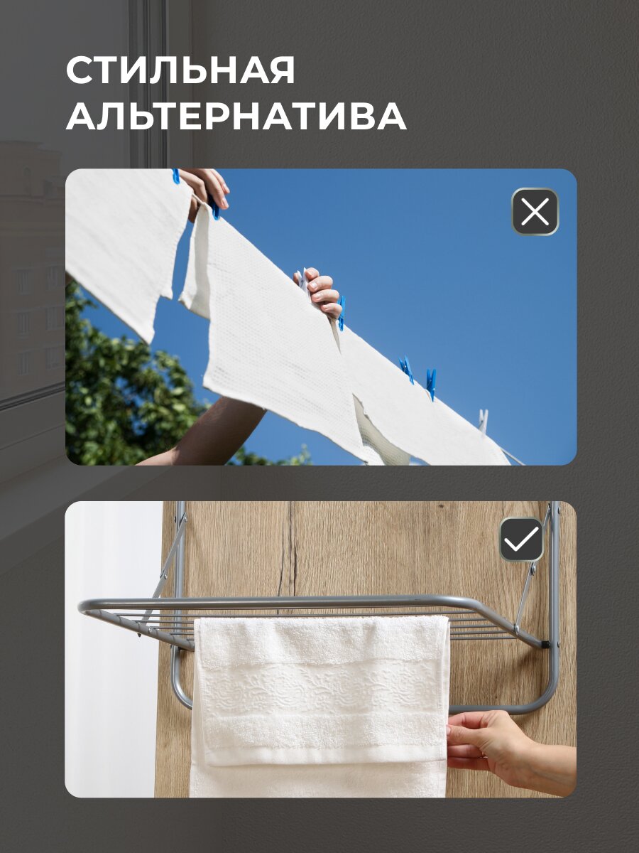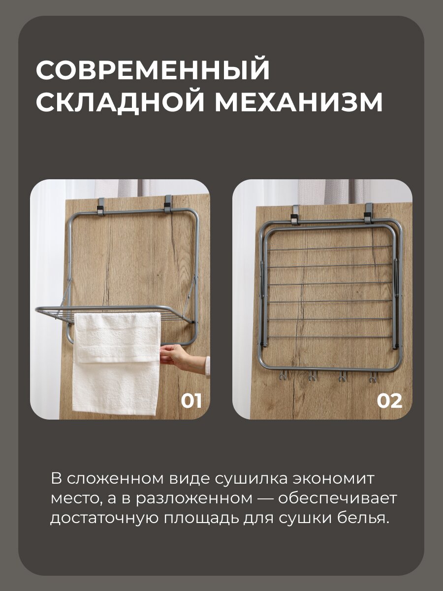 Навесная сушилка на дверь экономит место, быстро складывается и не требует отдельного хранения — идеальный выбор для малогабаритных помещений.