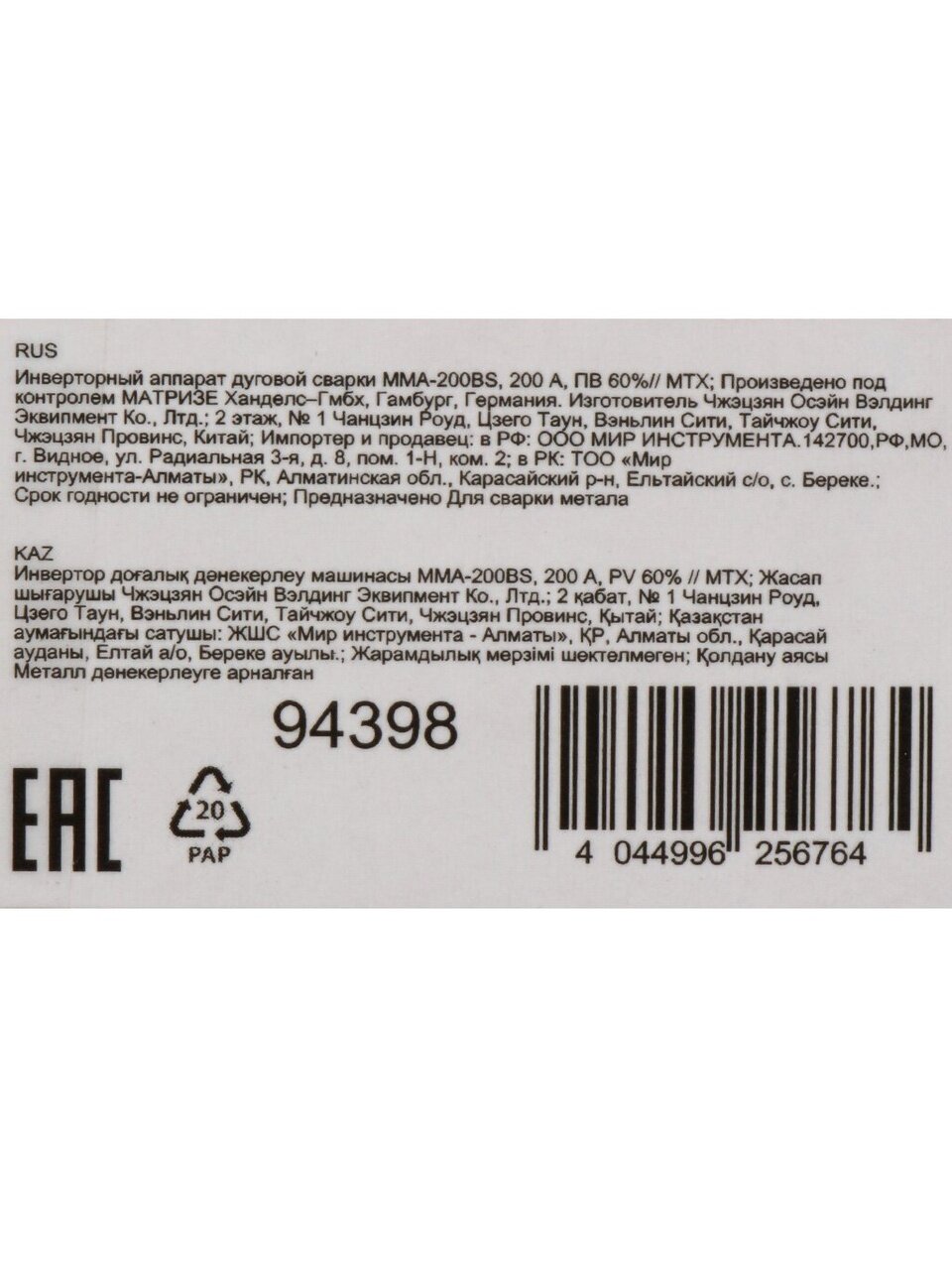 Вы можете приобрести «Сварочный аппарат инверторный, MTX, MMA-200BS, 6.4 кВт, 200 А, электрод, дуговой, ПВ 60 %» и другие товары в нашем интернет-магазине в Нижнем Новгороде по низким ценам и с бесплатным самовывозом.