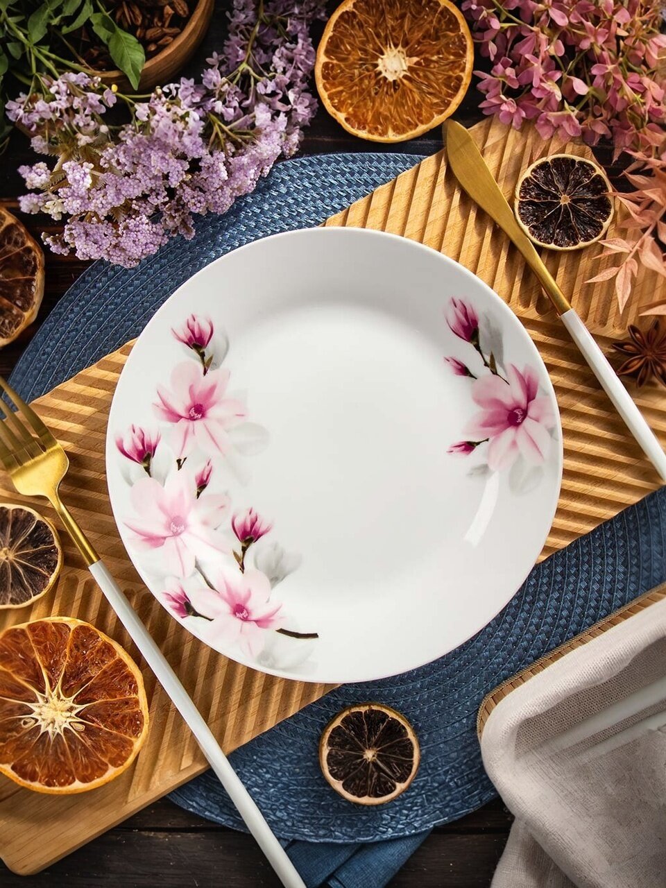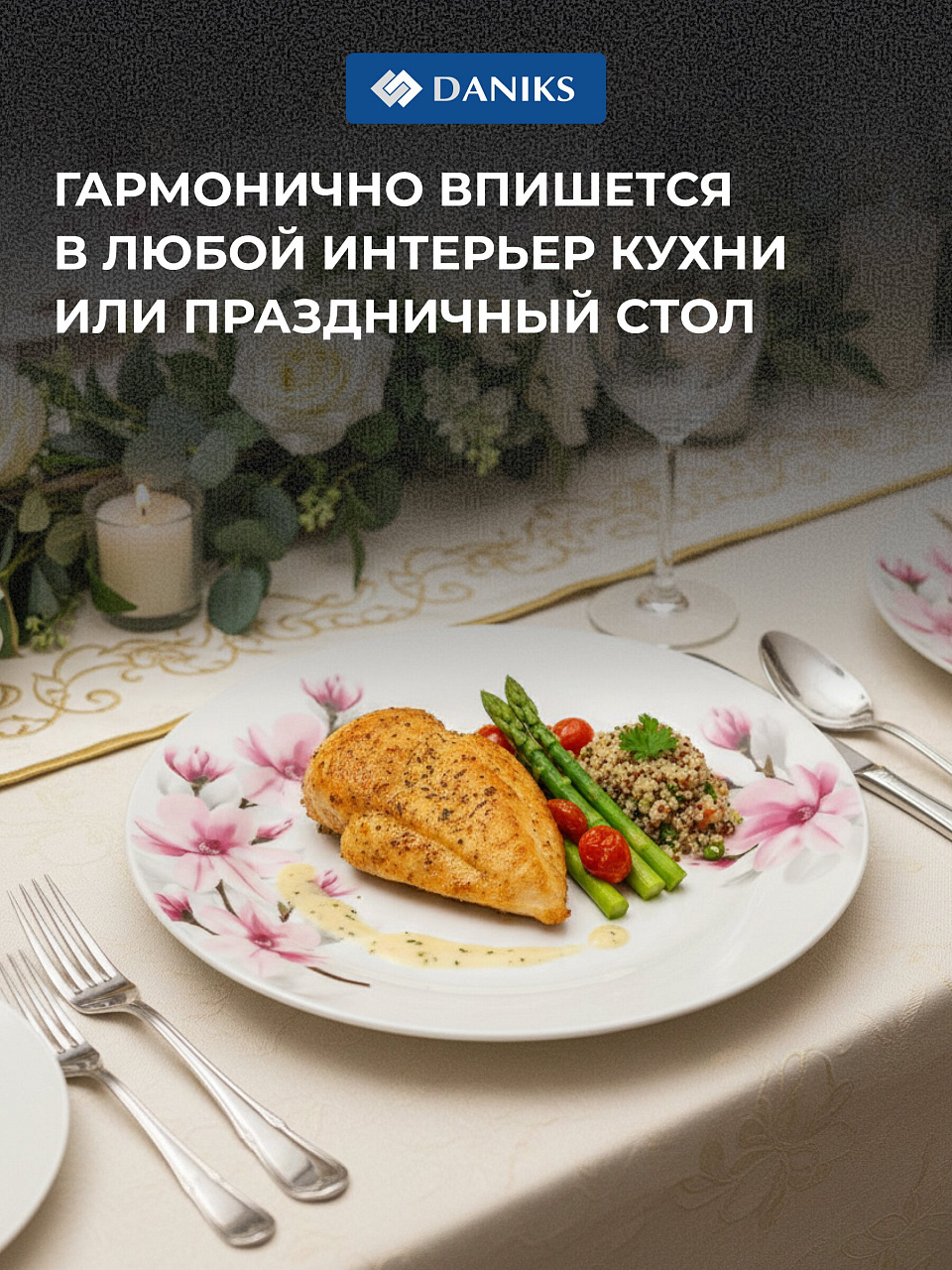 Обеденная тарелка Daniks «Нежность» 20 см — стильный акцент для сервировки: прочная керамика, цветочный дизайн, подходит для СВЧ и посудомоечной машины.