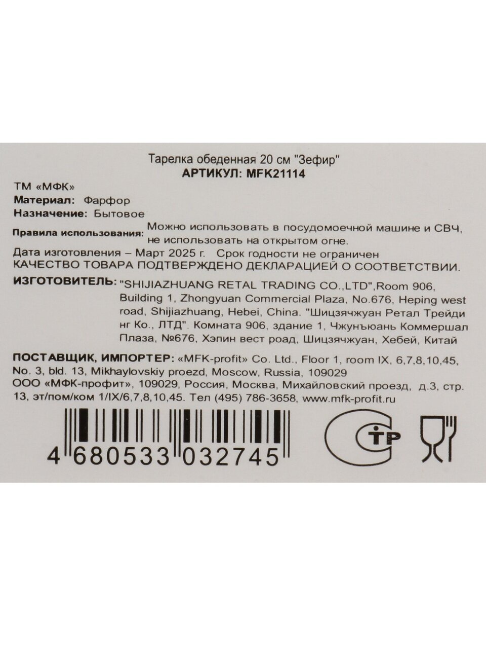 Вы можете приобрести «Тарелка обеденная, фарфор, 20 см, круглая, Зефир, МФК, MFK21114» и другие товары в нашем интернет-магазине в Ельце по низким ценам и с бесплатным самовывозом.