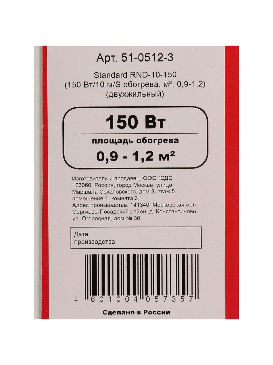 Если площадь обогрева составляет 0,9–1,2 м², оптимальным решением будет двухжильный кабель длиной 10 м и мощностью 150 Вт, как у Standard RND-10-150. Такой вариант обеспечивает равномерное тепло и удобен в монтаже.