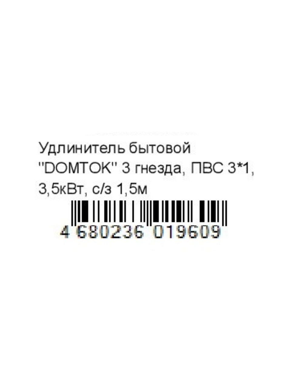 Удлинитель Domtok 2379: 3 розетки, 1.5 м, заземление, выключатель — безопасное решение для дома и дачи, выдерживает до 3500 Вт.