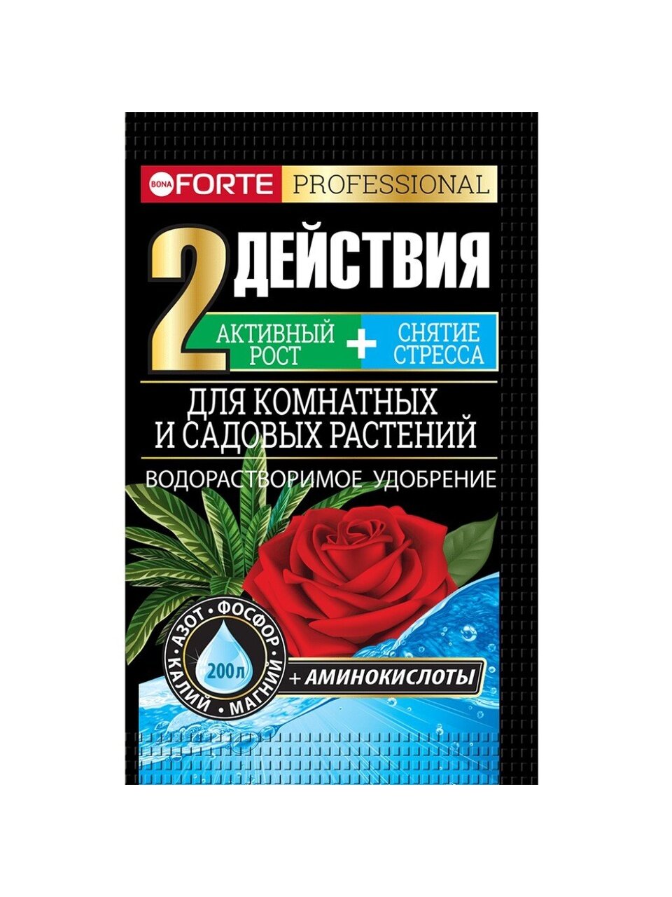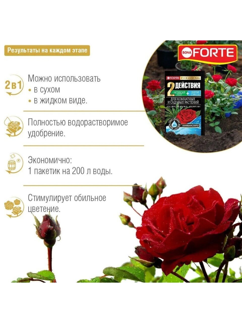 Bona Forte – полностью водорастворимое удобрение для комнатных и садовых растений. Одного пакетика хватает на 200 литров воды. Состав стабилизирует уровень pH почвы и стимулирует обильное цветение. Удобрение можно использовать при посадке или для подкормки.