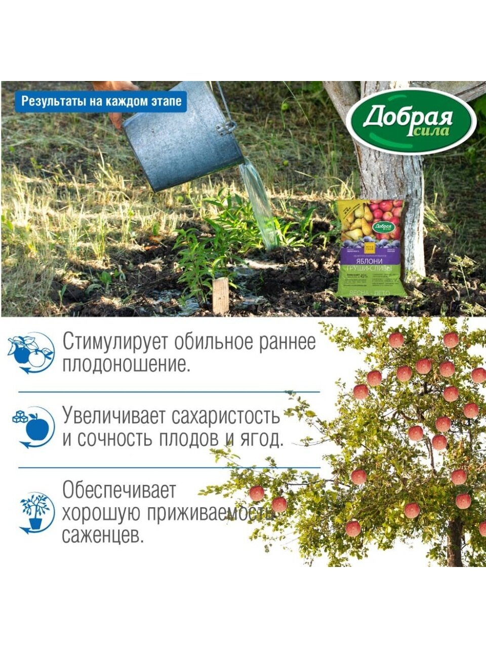 Удобрение Добрая сила рекомендовано для плодовых и ягодных культур: яблони, груши, абрикоса, персика, смородины, вишни, сливы, алычи, черешни, крыжовника, жимолости. Удобрение обогащено цеолитами, содержащими биодоступный кремний.