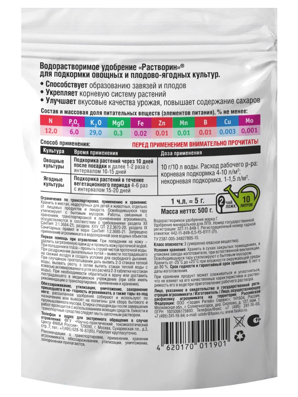 Какие параметры у удобрения Растворин Фаско?