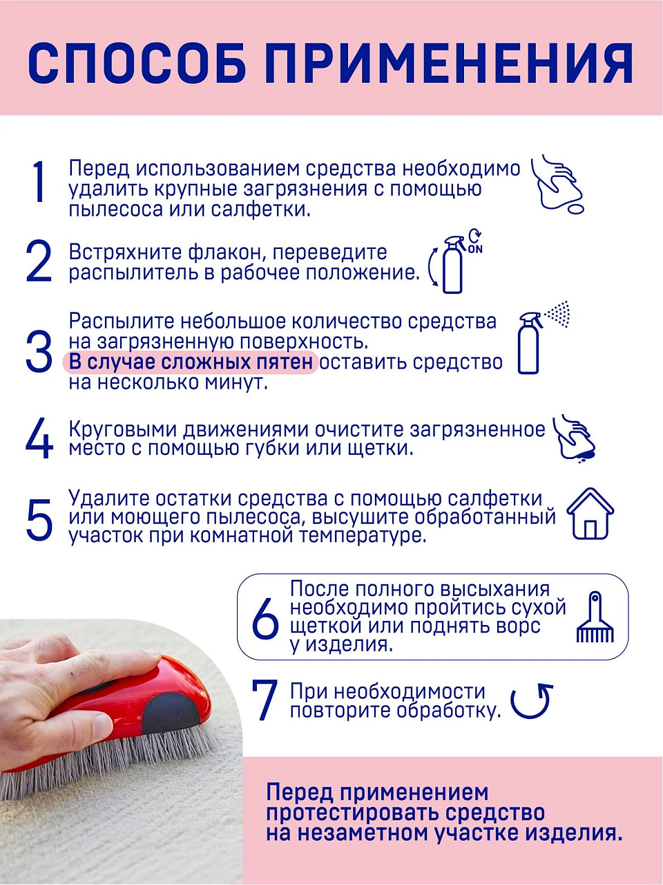 Распылите средство на загрязнённую поверхность, оставьте на 5–10 минут, затем удалите остатки губкой или пылесосом. Не требует смывания водой. Объём флакона — 500 мл, хватает на обработку нескольких ковров или мебели.