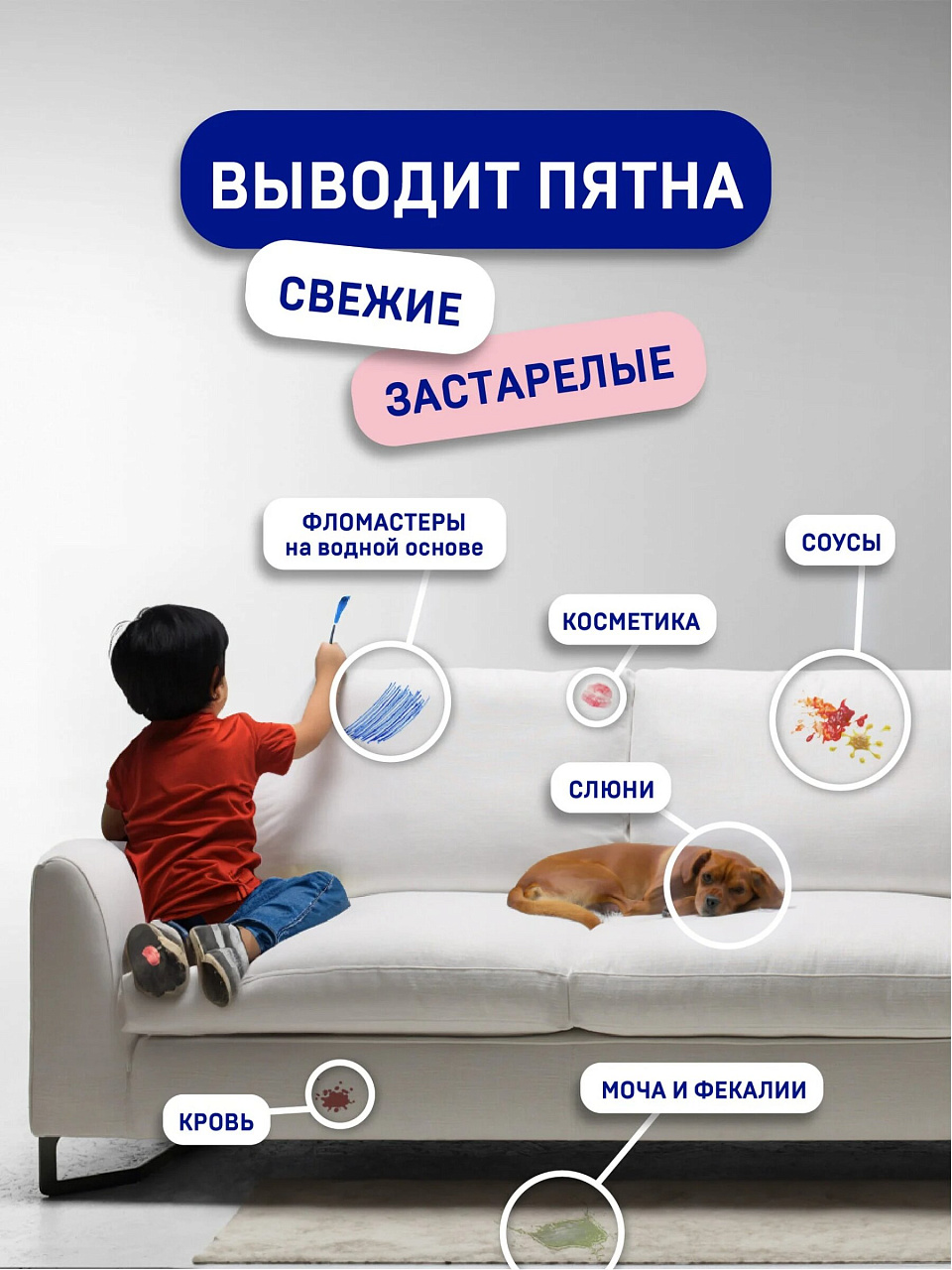 Пенообразующая формула обеспечивает глубокое очищение волокон, быстро устраняет запахи и пятна, подходит для светлых тканей, не оставляет следов и липкости.