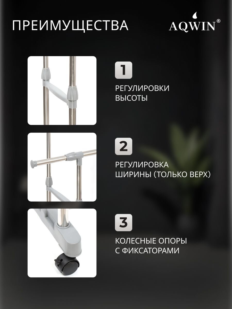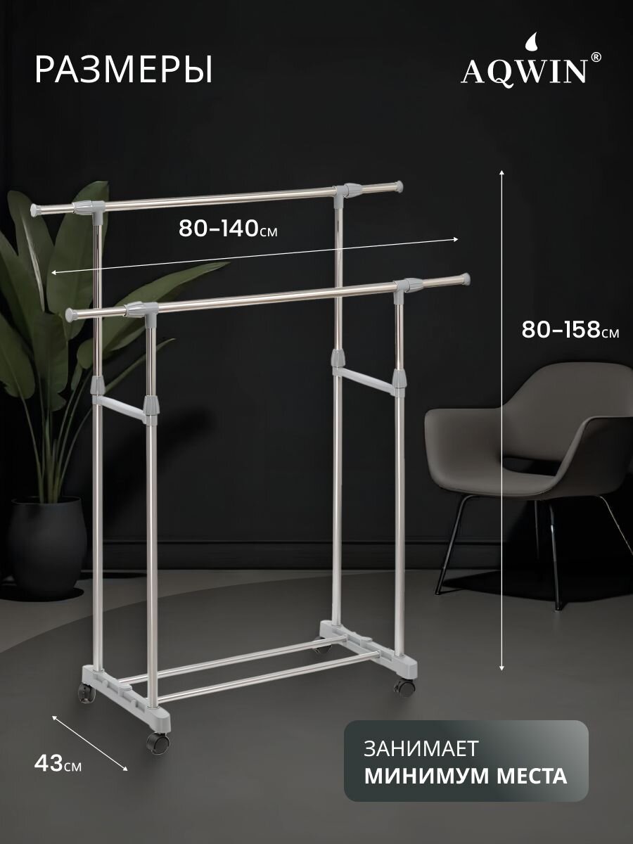 Вешалка напольная Aqwin 140х43х158 см — мобильное решение для хранения одежды: телескопическая конструкция, металл, колёса, современный стиль.