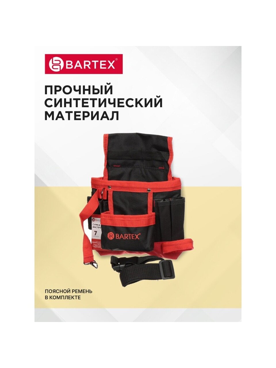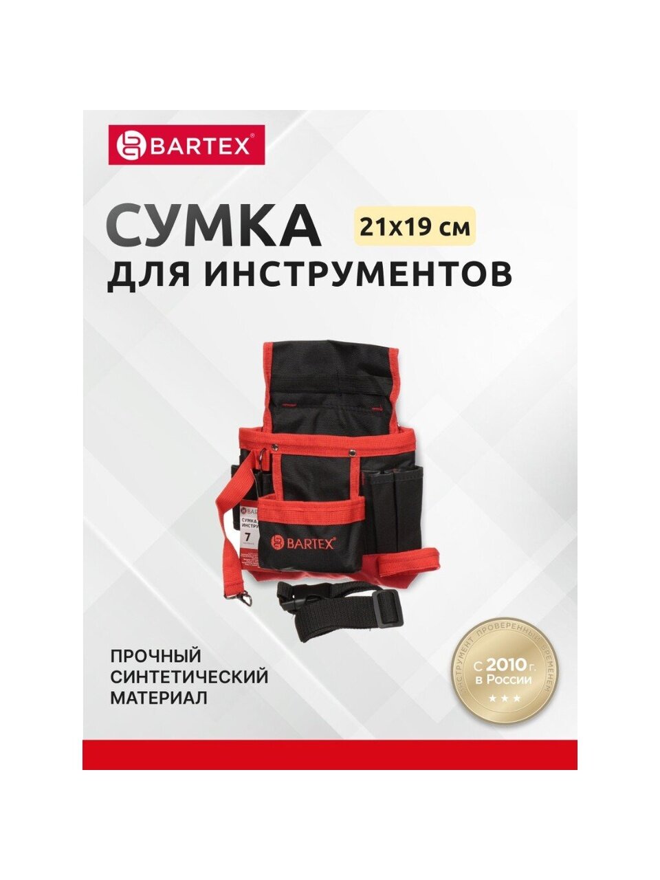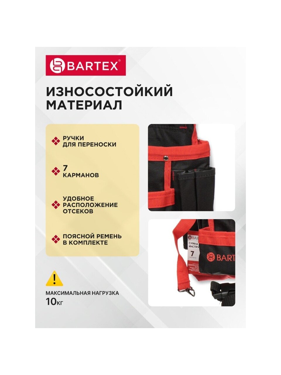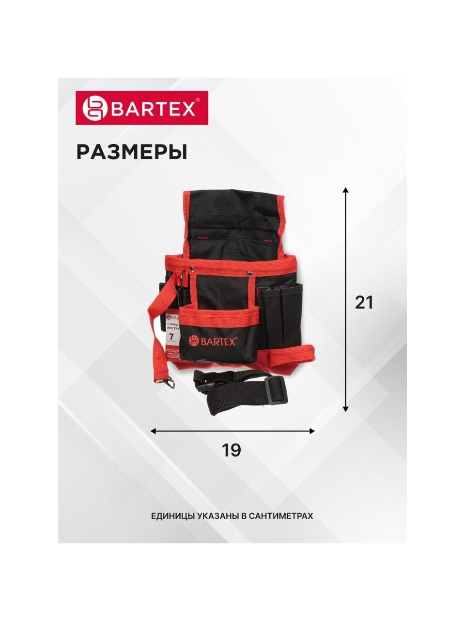 Сумка Bartex - идеальный помощник в тех случаях, когда ремонтные работы проводятся вдалеке от дома или привычного места хранения инструментов. Такой переносной аксессуар поможет Вам оптимизировать процесс ремонта и сократить время на поиски нужного инструмента.