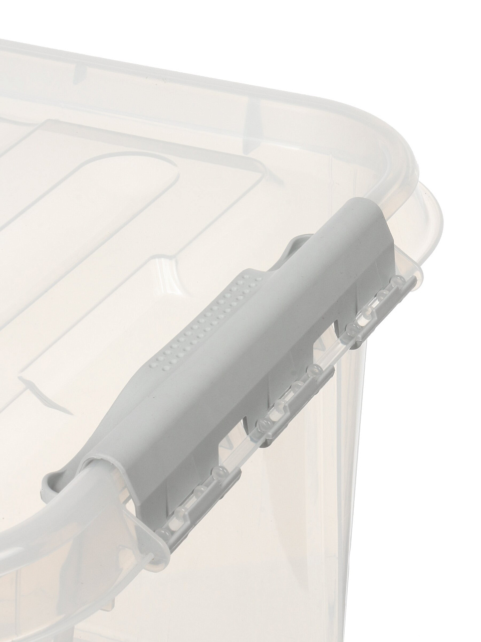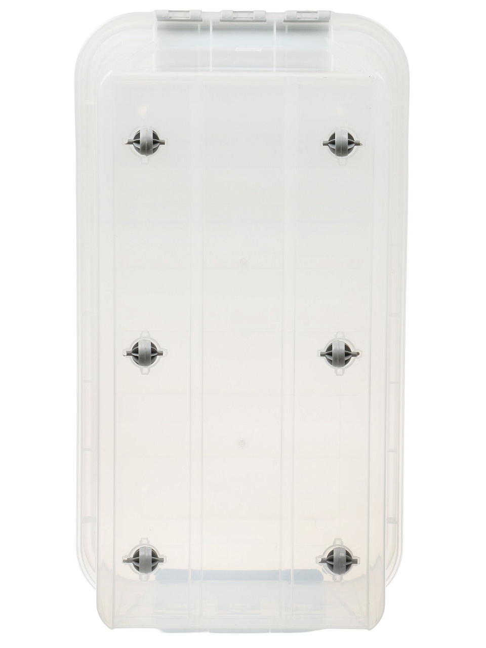 - Уникальное решение — вместительный пластиковый ящик на колесах с защелками для надежного хранения и легкой транспортировки;