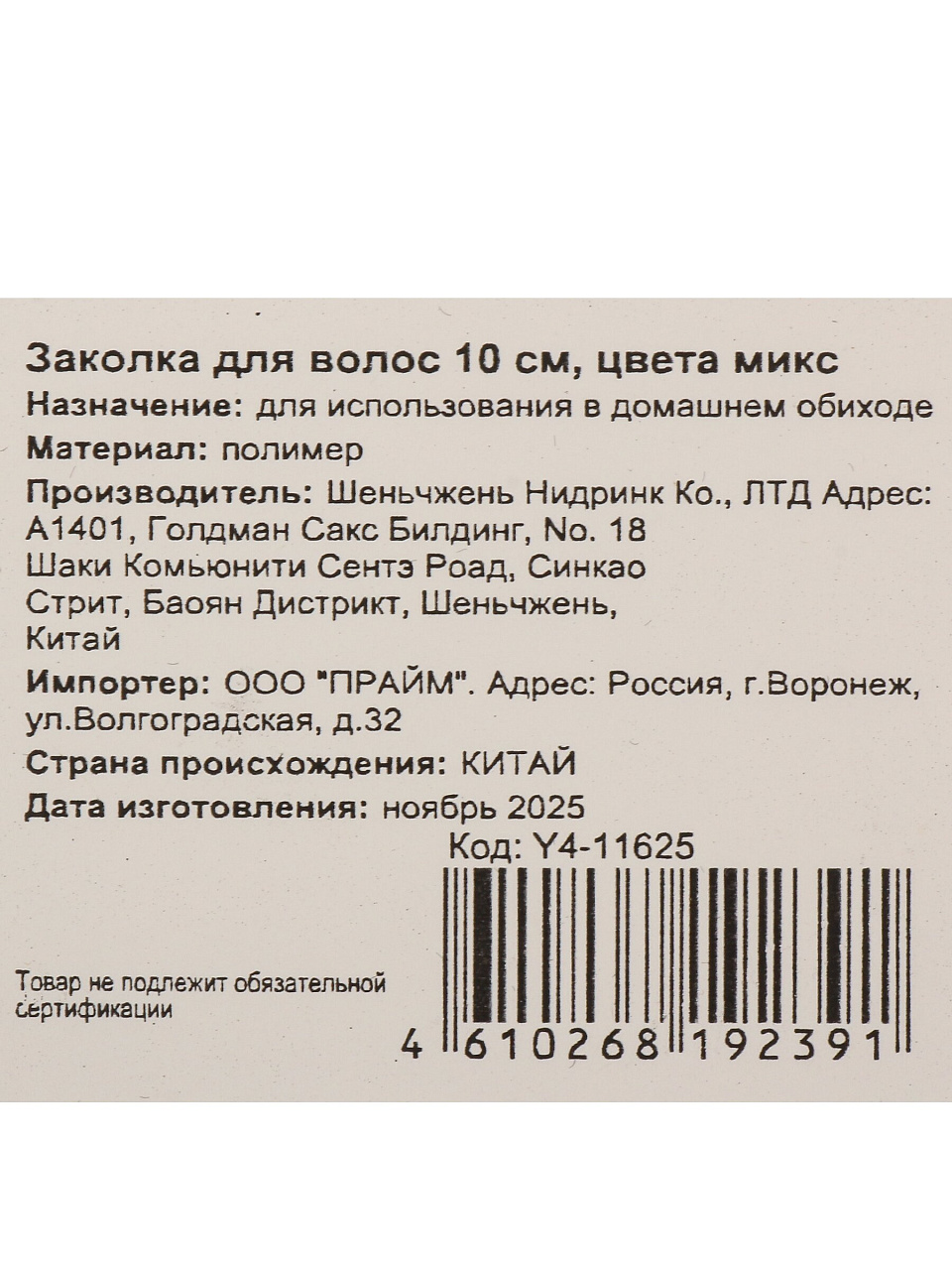 Заколка для волос 10 см, пластик, в ассортименте, Y4-11625